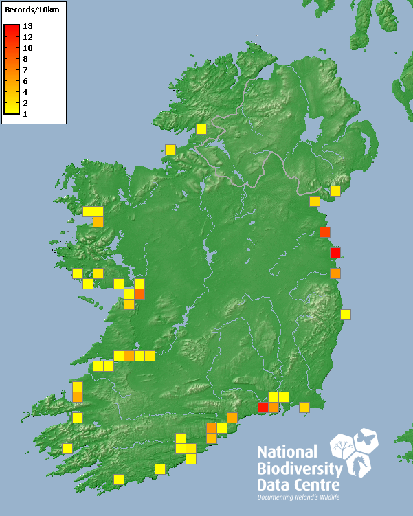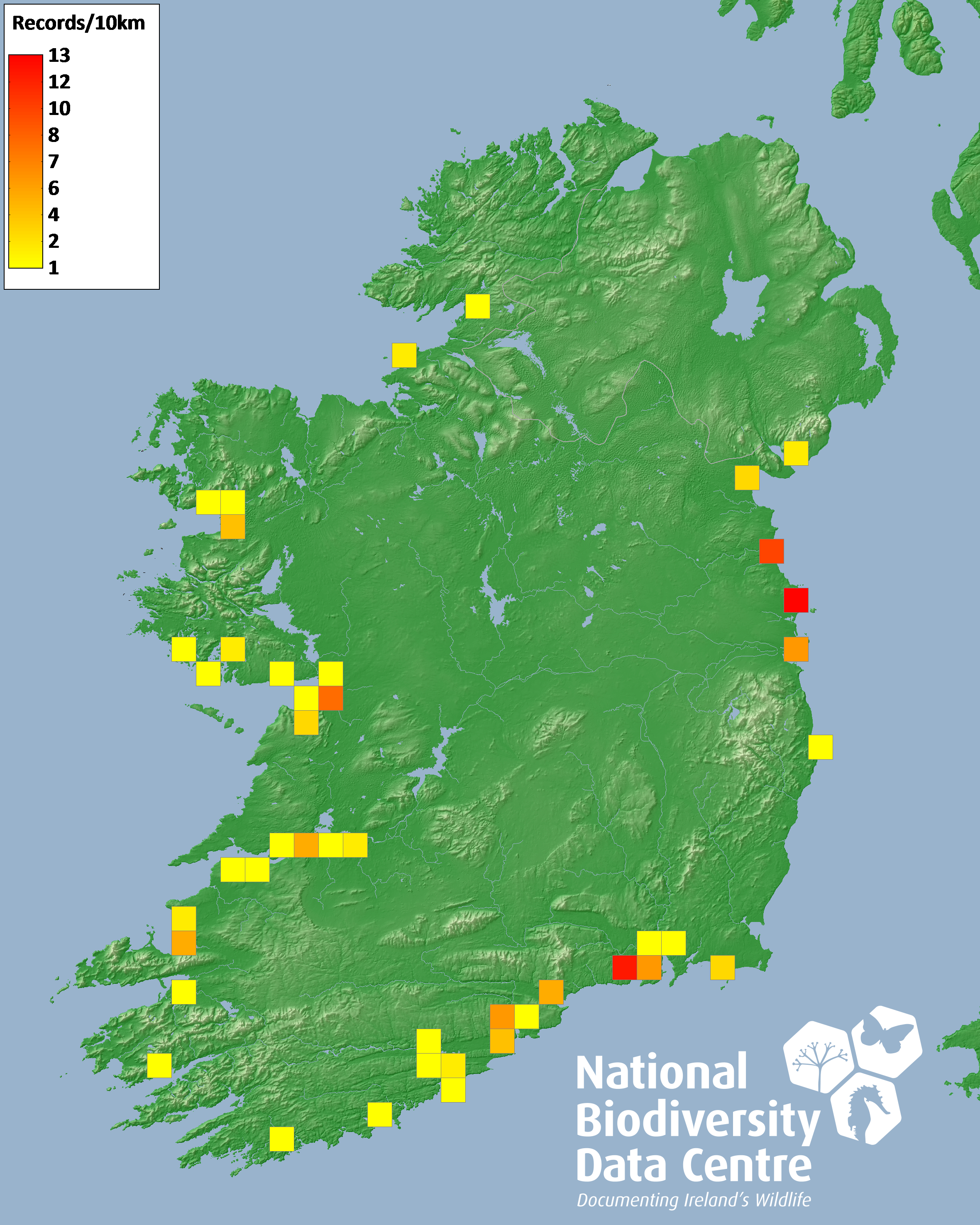 Distribution of the number of records recorded within each 10km grid square (ITM).Marine Map - 50km