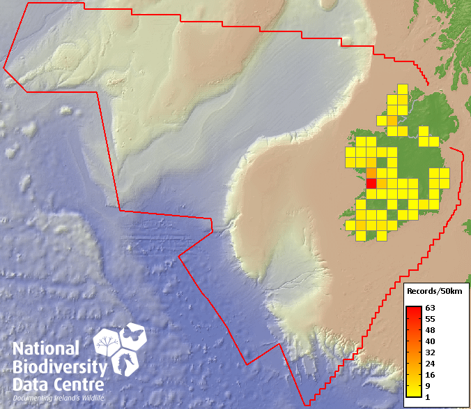Distribution of the number of records recorded within each 10km grid square (ITM).Marine Map - 50km