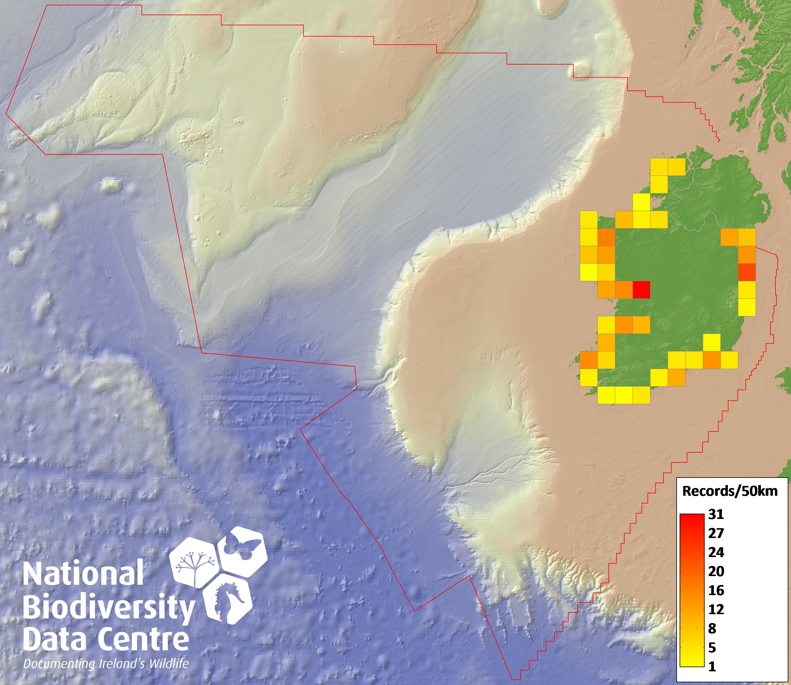 Distribution of the number of records recorded within each 10km grid square (ITM).Marine Map - 50km