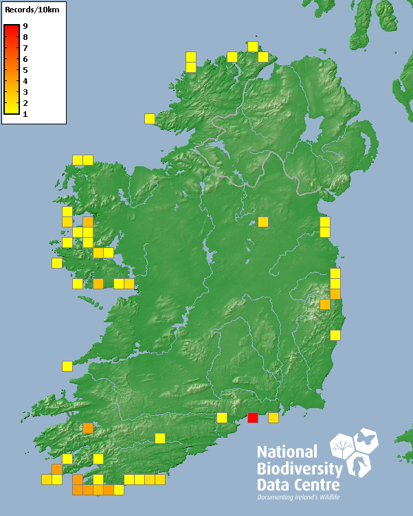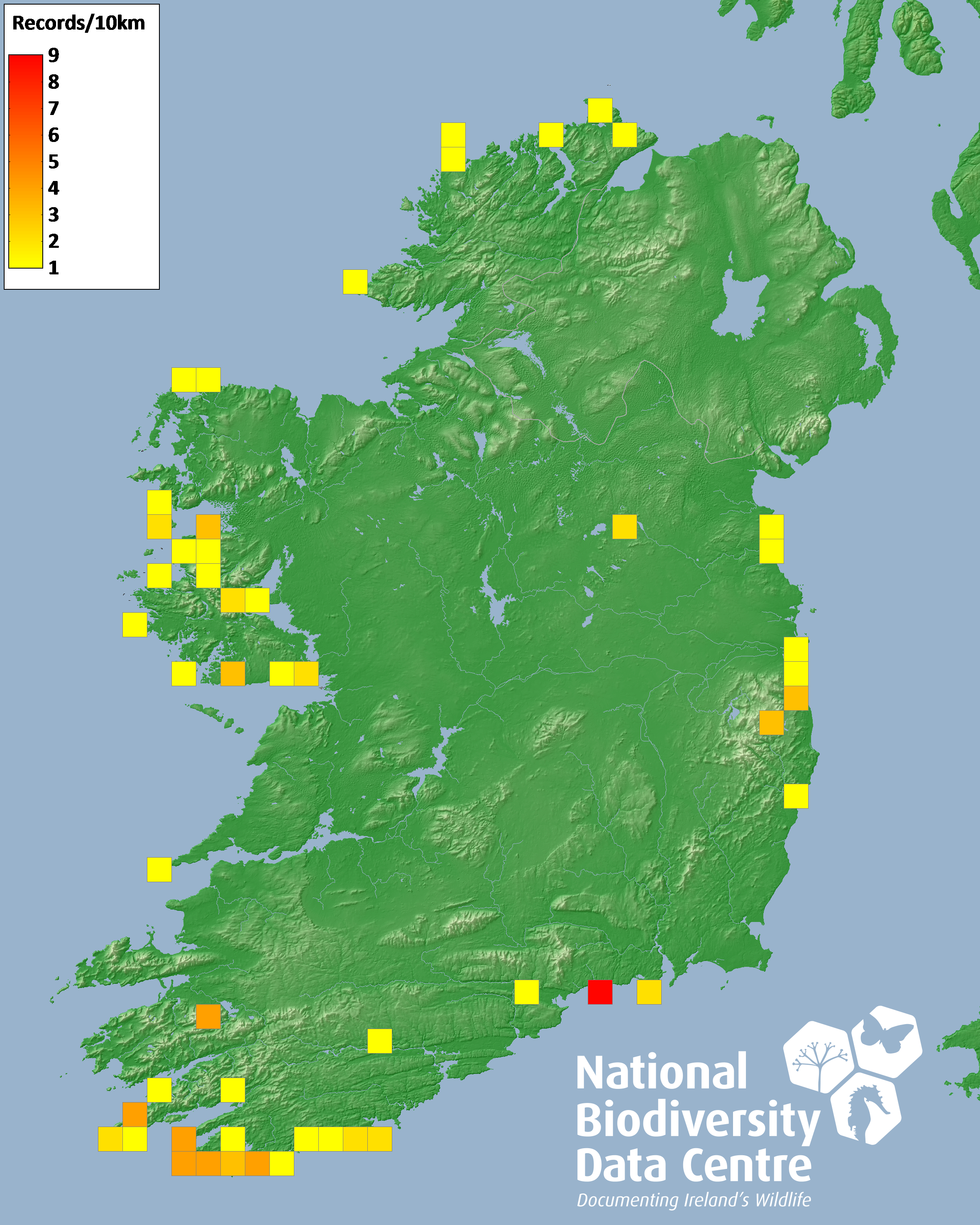 Distribution of the number of records recorded within each 10km grid square (ITM).Marine Map - 50km