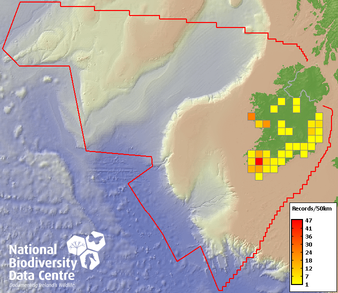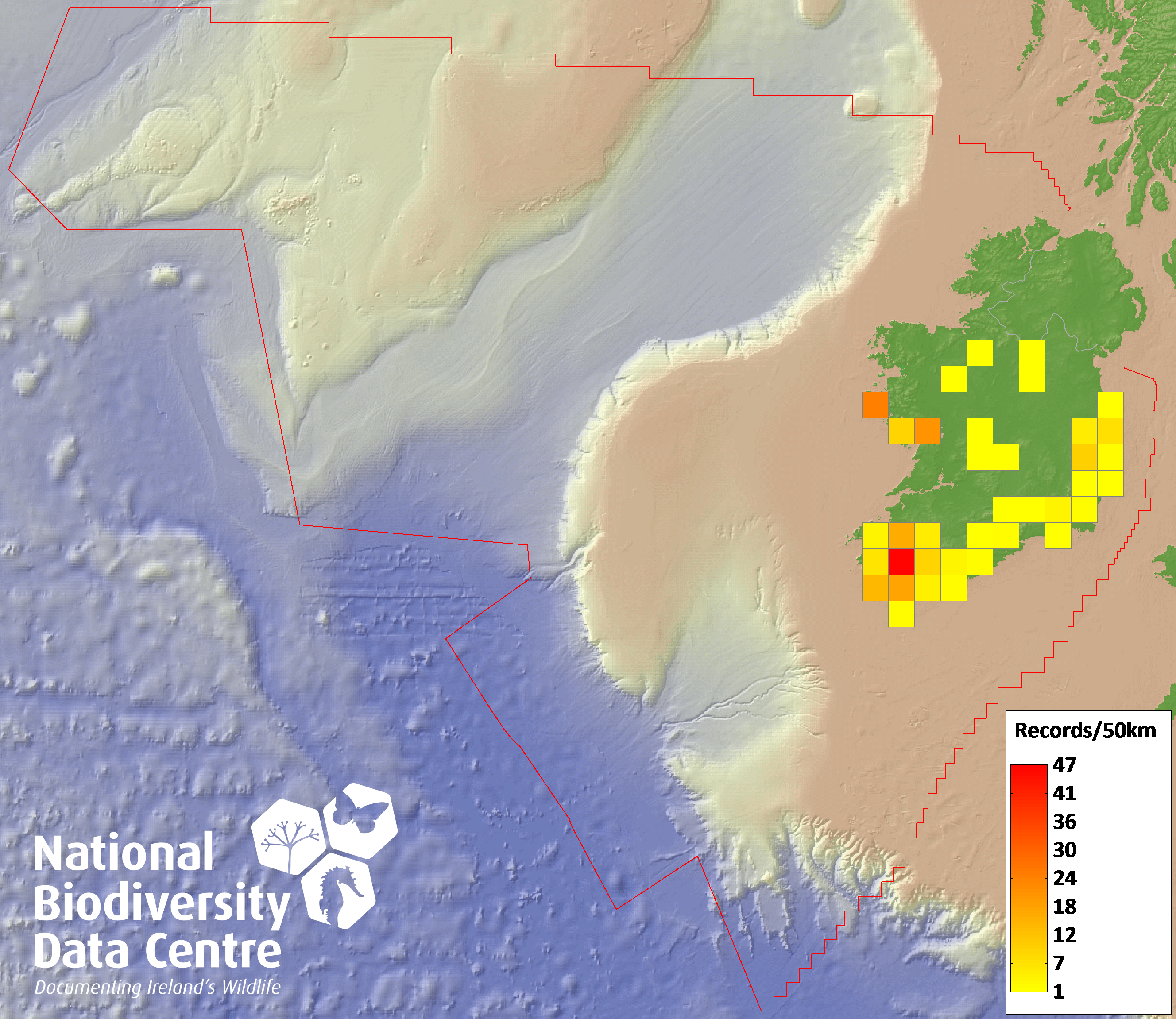 Distribution of the number of records recorded within each 10km grid square (ITM).Marine Map - 50km