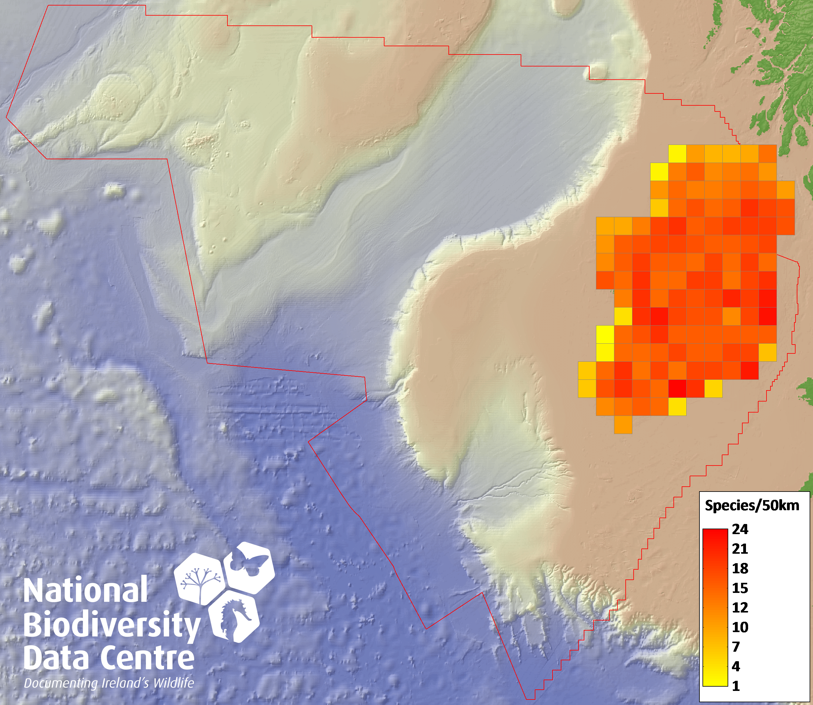 Distribution of the number of species recorded within each 10km grid square (ITM).Marine Map - 50Km