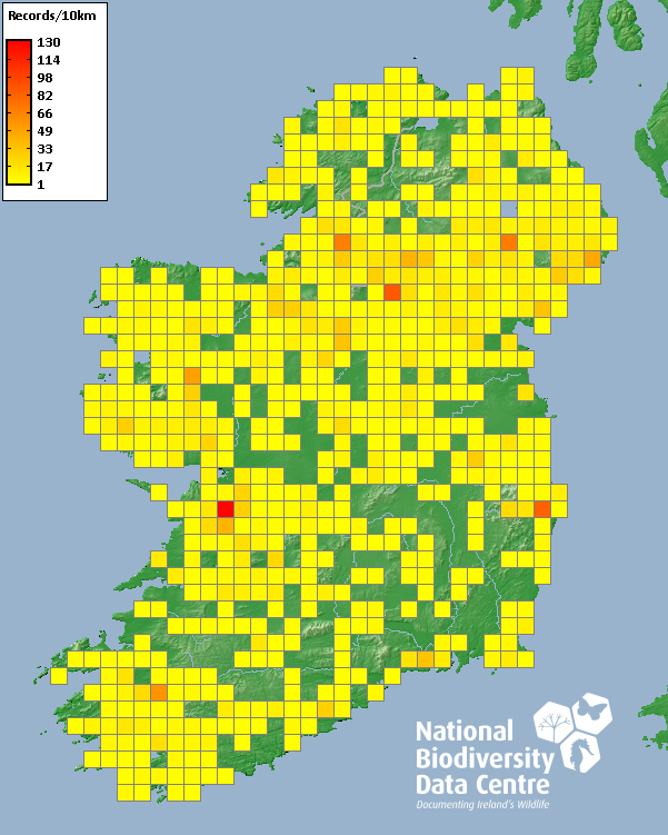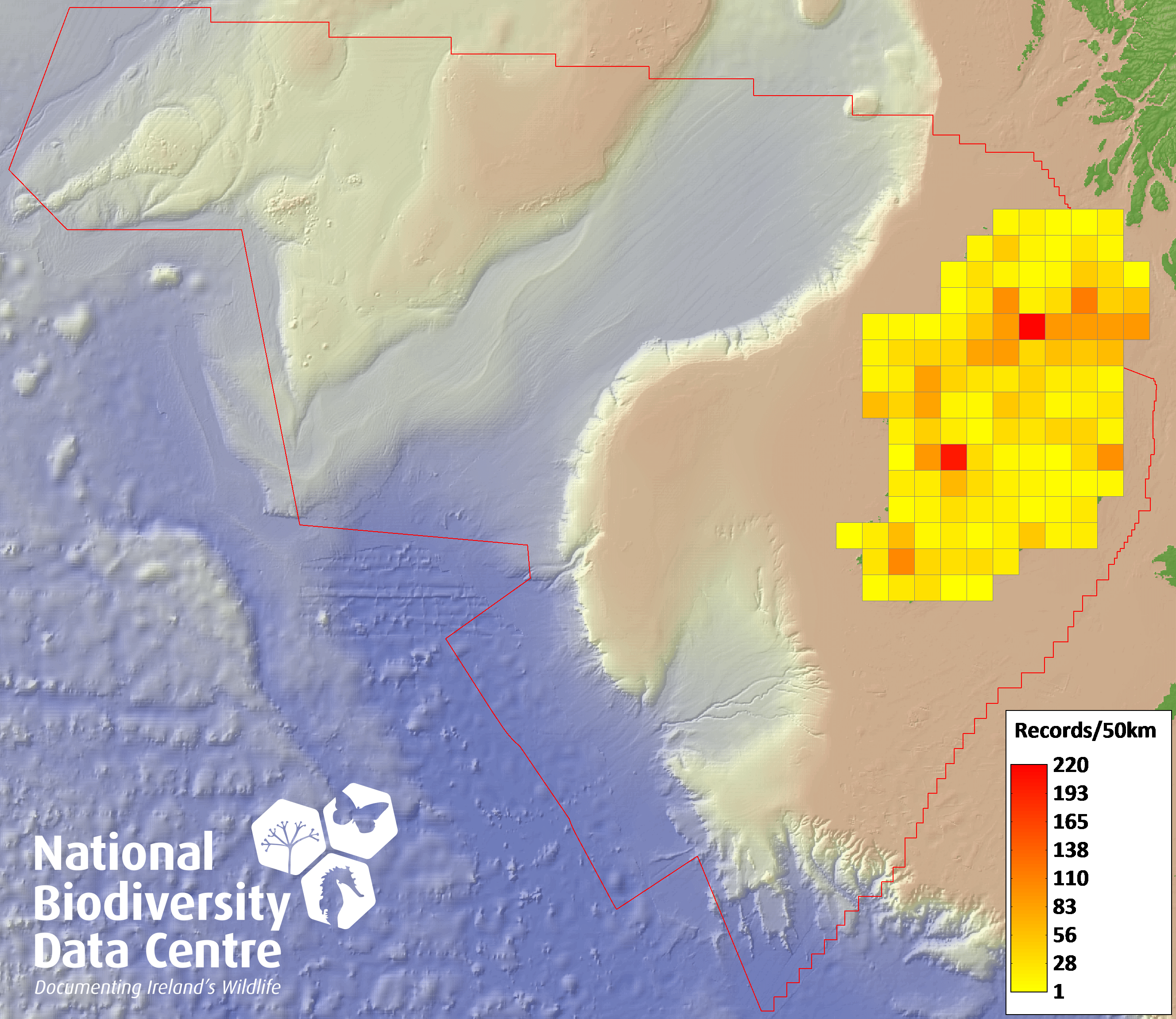 Distribution of the number of records recorded within each 10km grid square (ITM).Marine Map - 50km