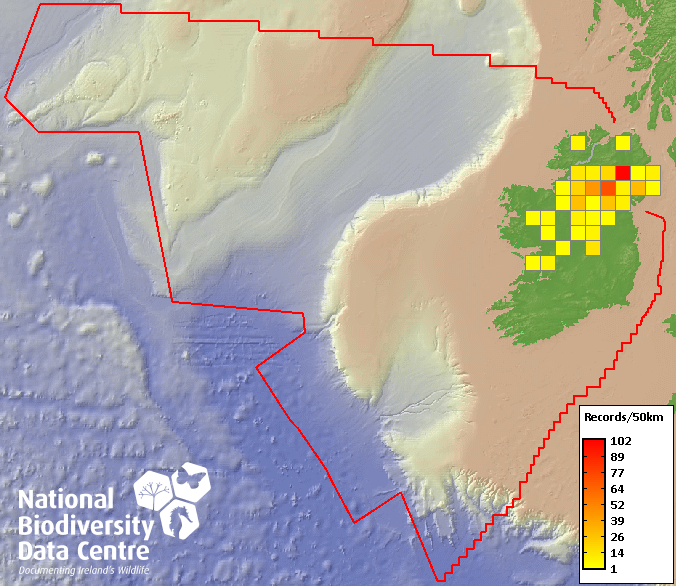 Distribution of the number of records recorded within each 10km grid square (ITM).Marine Map - 50km
