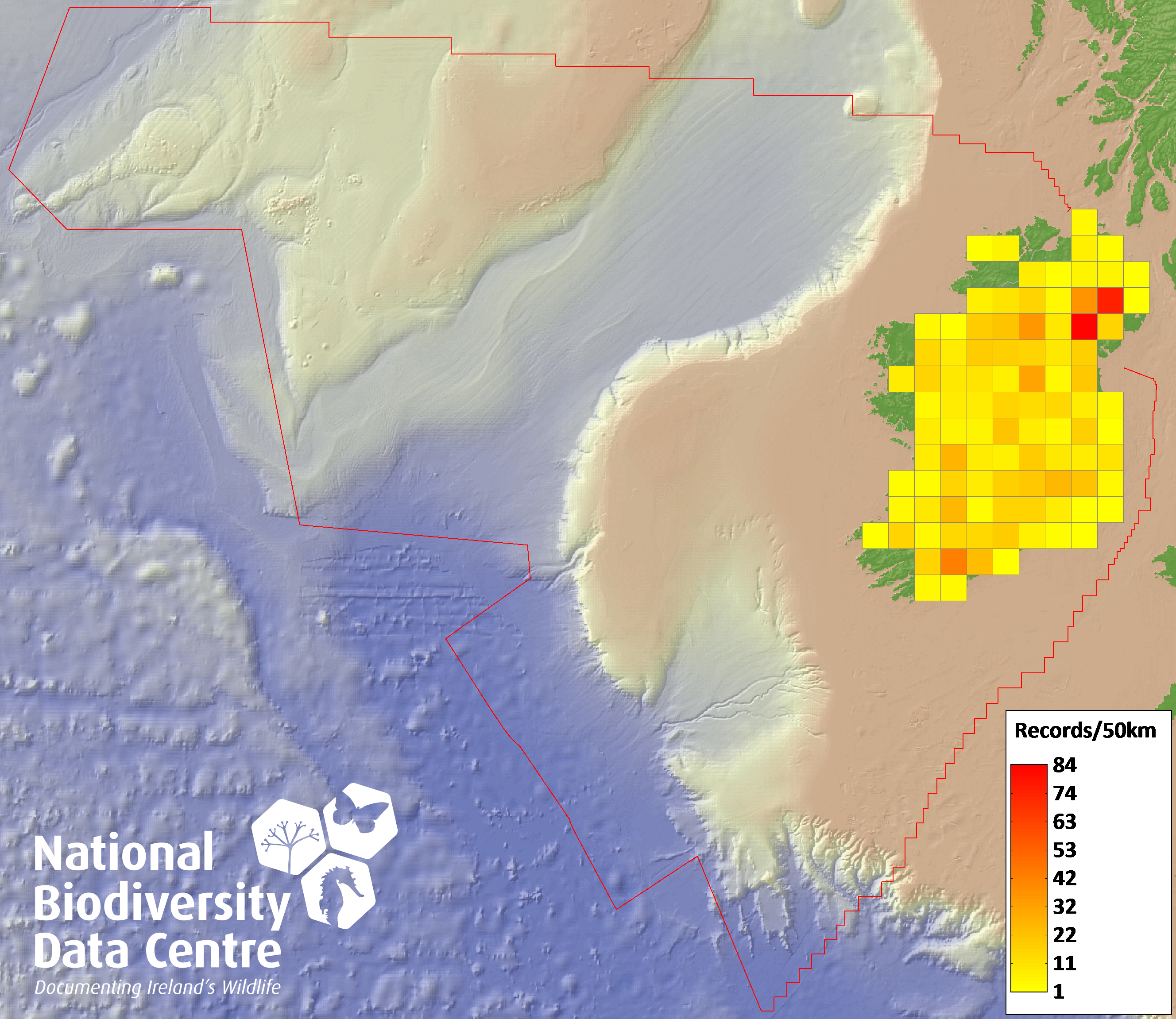 Distribution of the number of records recorded within each 10km grid square (ITM).Marine Map - 50km