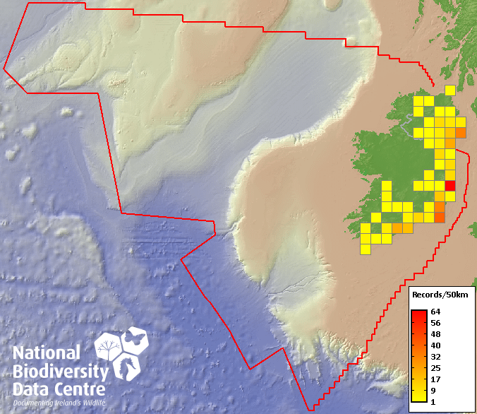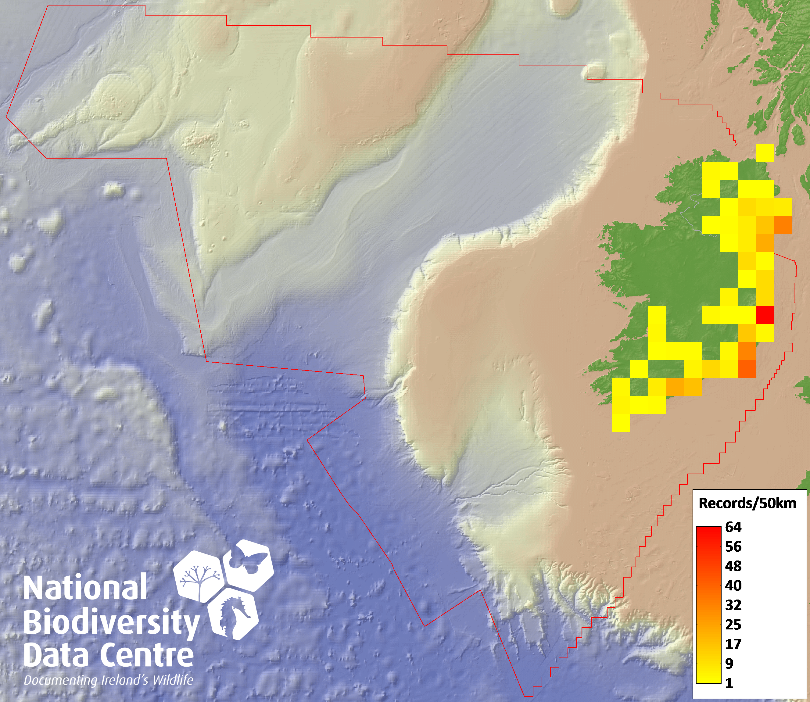 Distribution of the number of records recorded within each 10km grid square (ITM).Marine Map - 50km