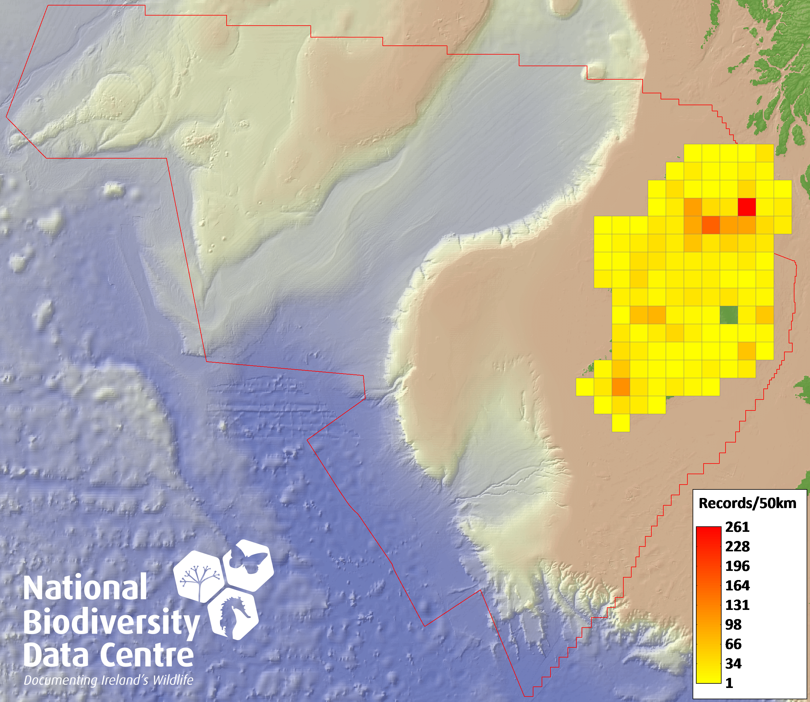 Distribution of the number of records recorded within each 10km grid square (ITM).Marine Map - 50km
