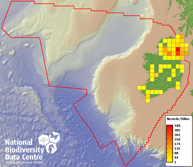 Distribution of the number of records within each 10km grid square (ITM).Marine Map - 50Km