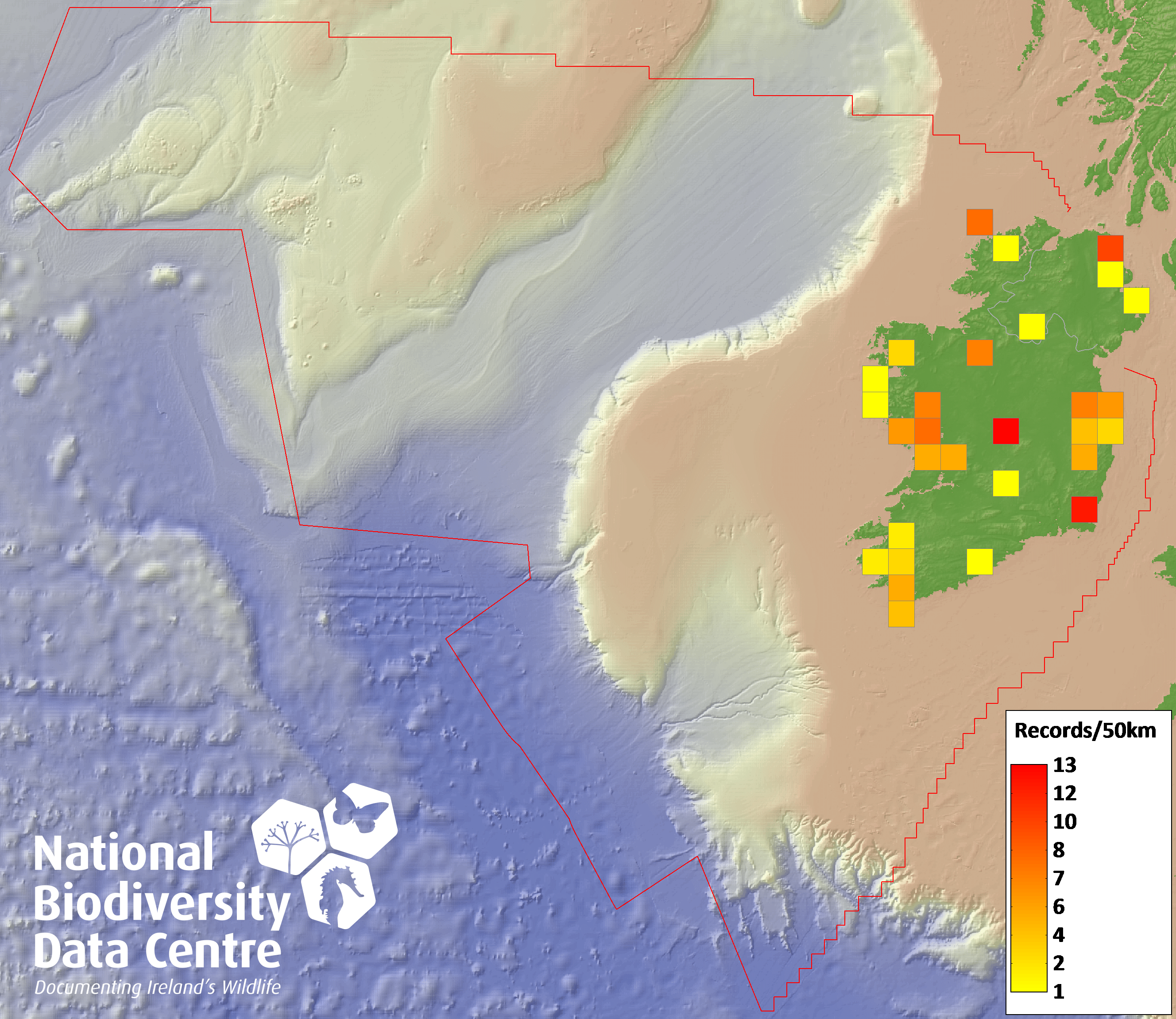 Distribution of the number of records recorded within each 10km grid square (ITM).Marine Map - 50km