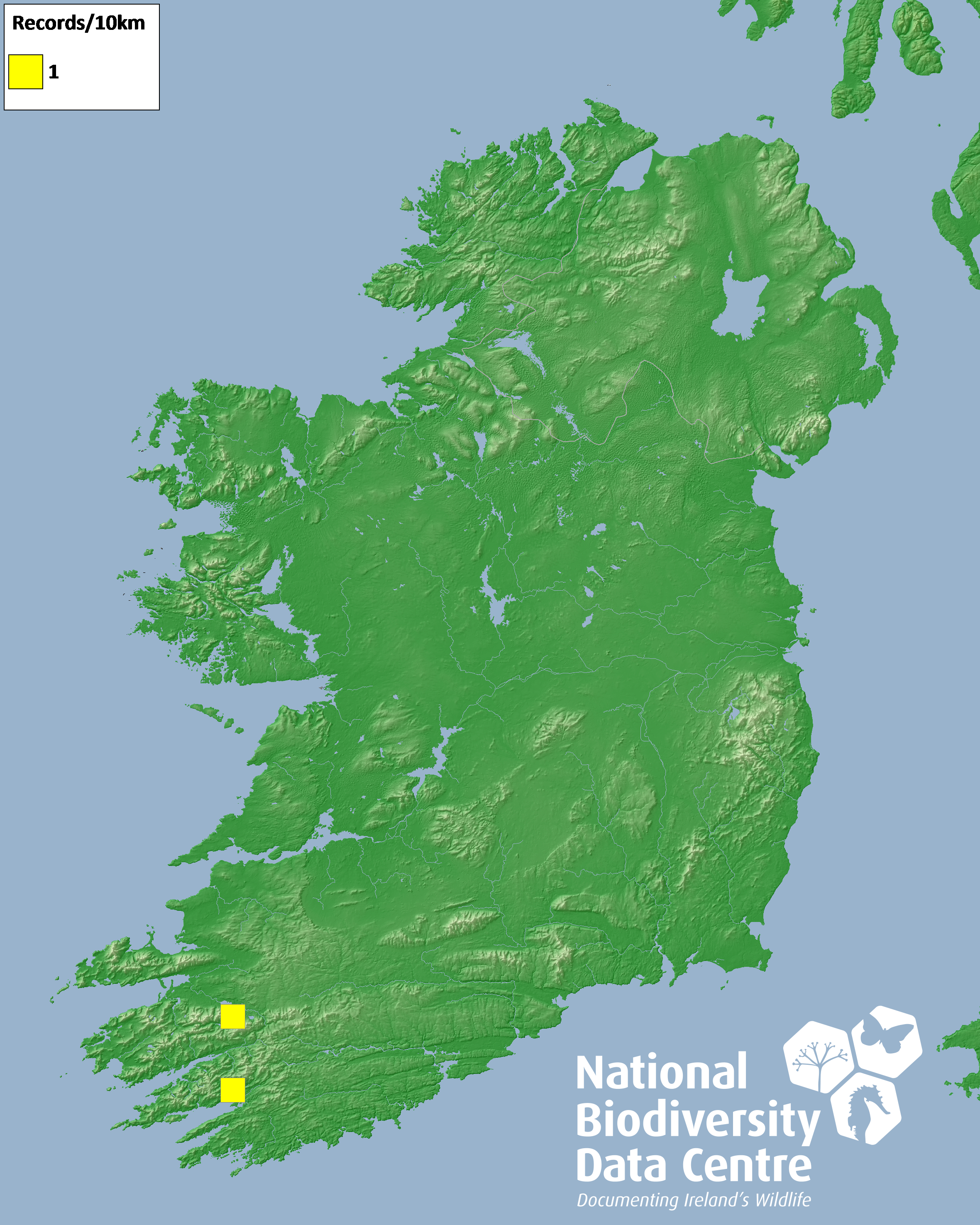 Distribution of the number of records recorded within each 10km grid square (ITM).Marine Map - 50km
