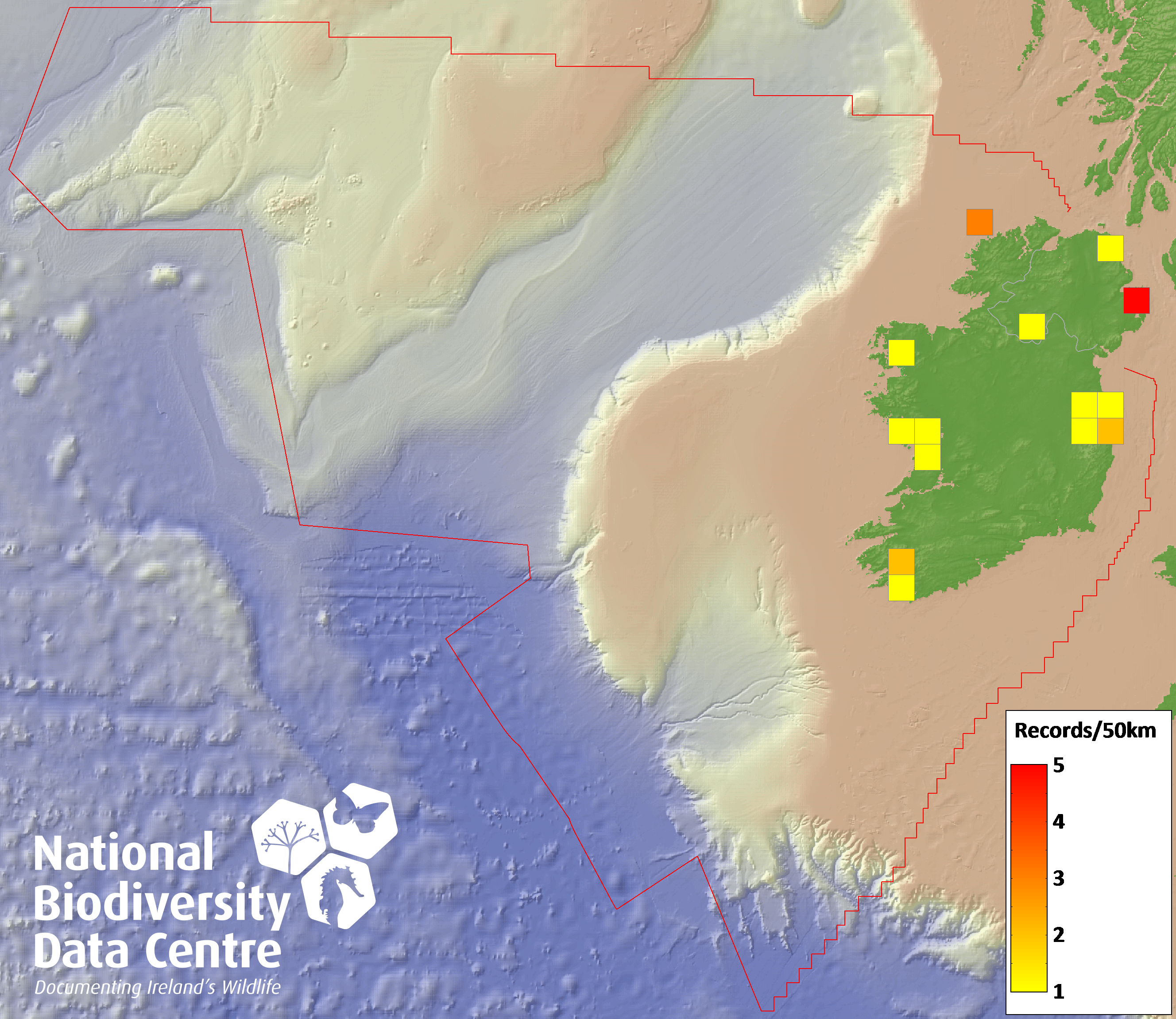 Distribution of the number of records recorded within each 10km grid square (ITM).Marine Map - 50km