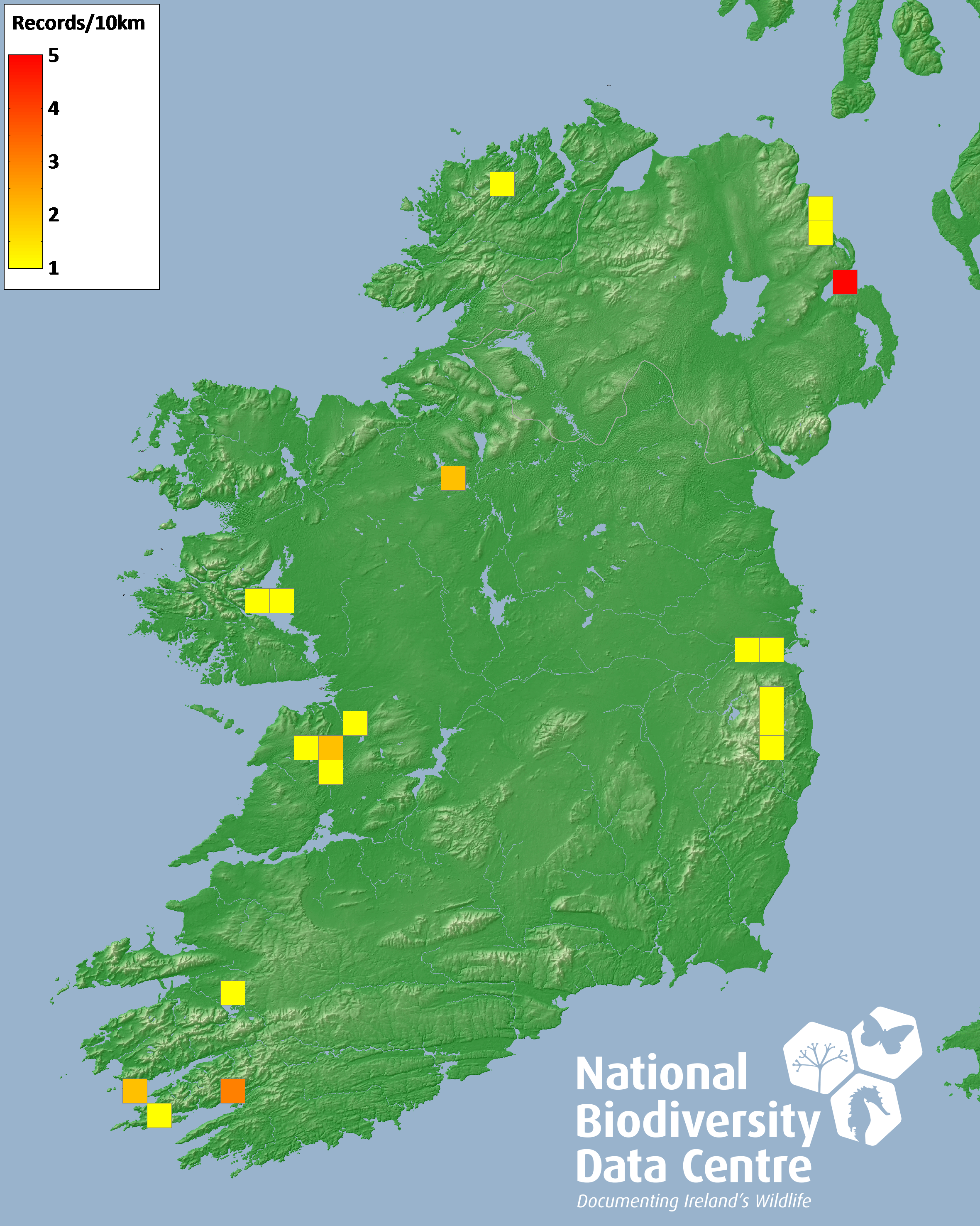 Distribution of the number of records recorded within each 10km grid square (ITM).Marine Map - 50km