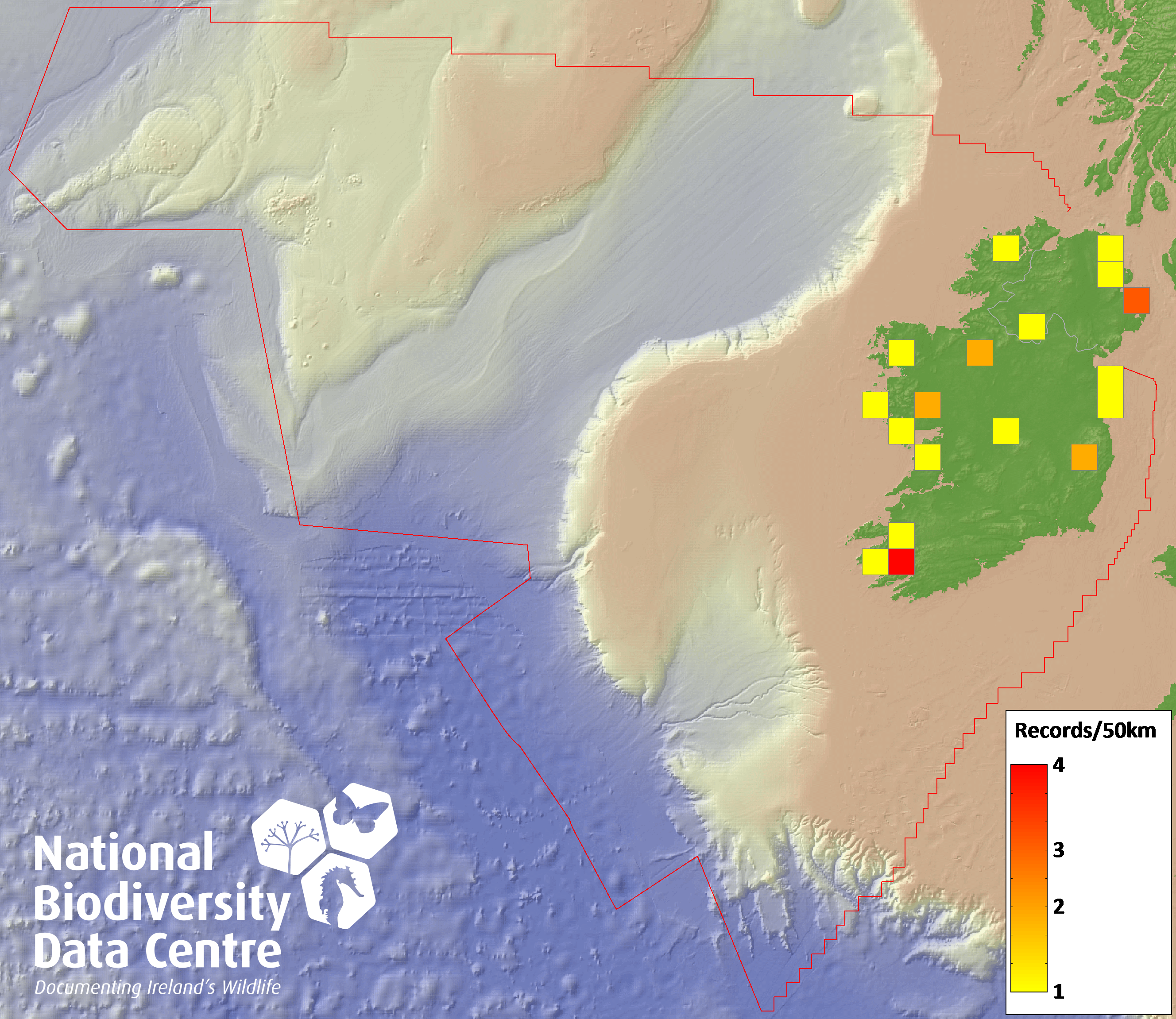 Distribution of the number of records recorded within each 10km grid square (ITM).Marine Map - 50km