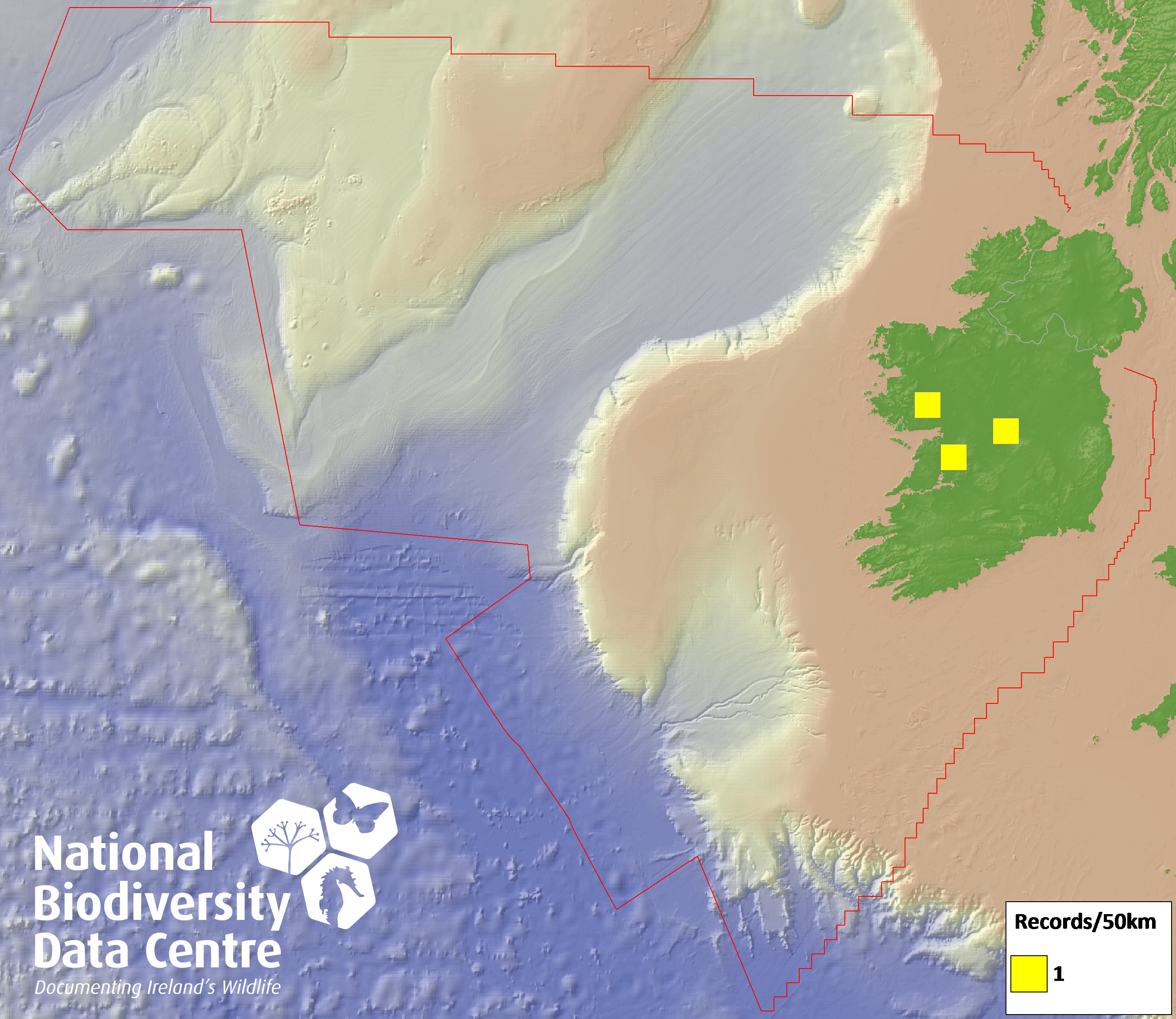 Distribution of the number of records recorded within each 10km grid square (ITM).Marine Map - 50km