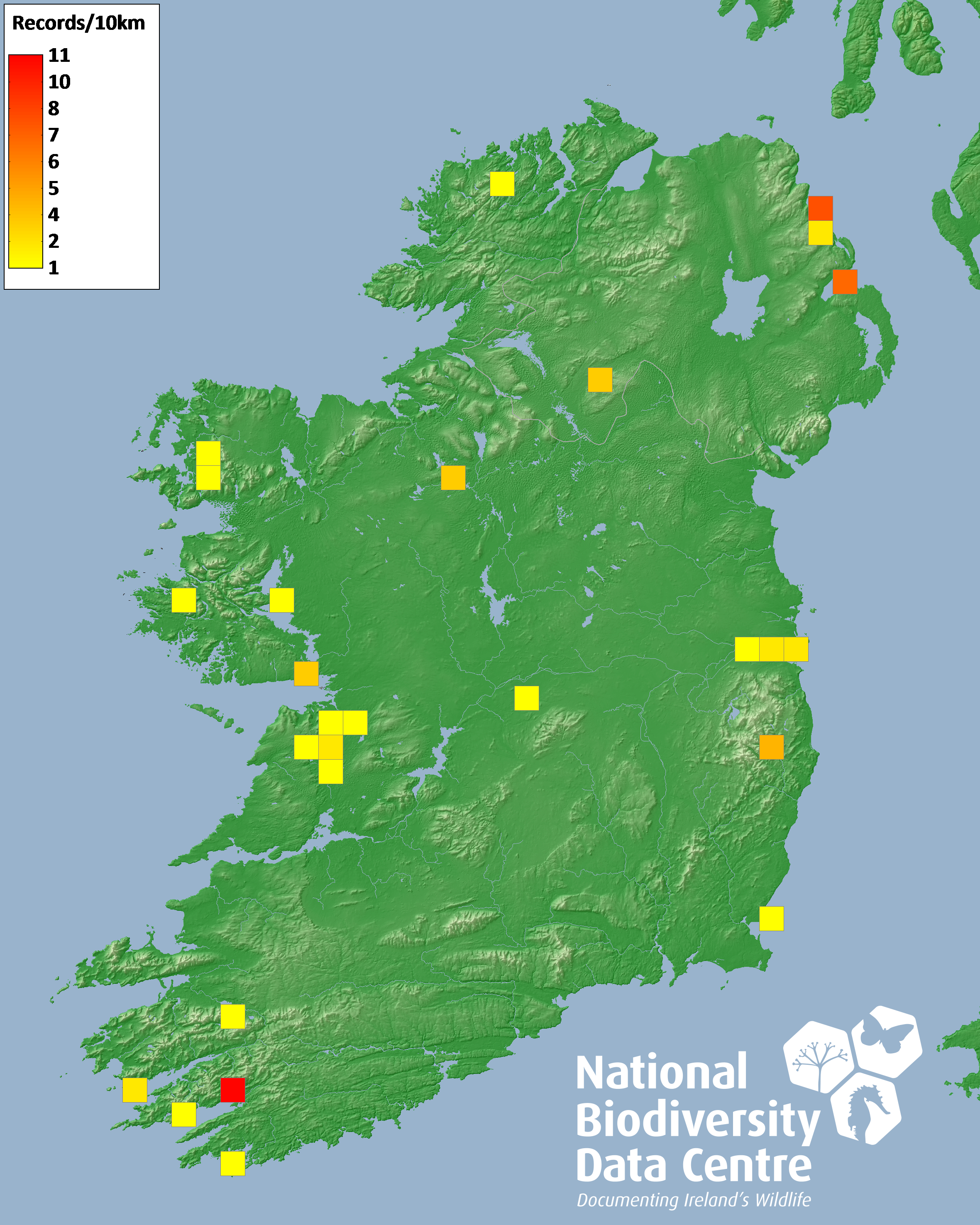 Distribution of the number of records recorded within each 10km grid square (ITM).Marine Map - 50km