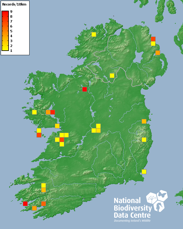 Distribution of the number of records recorded within each 10km grid square (ITM).Marine Map - 50km
