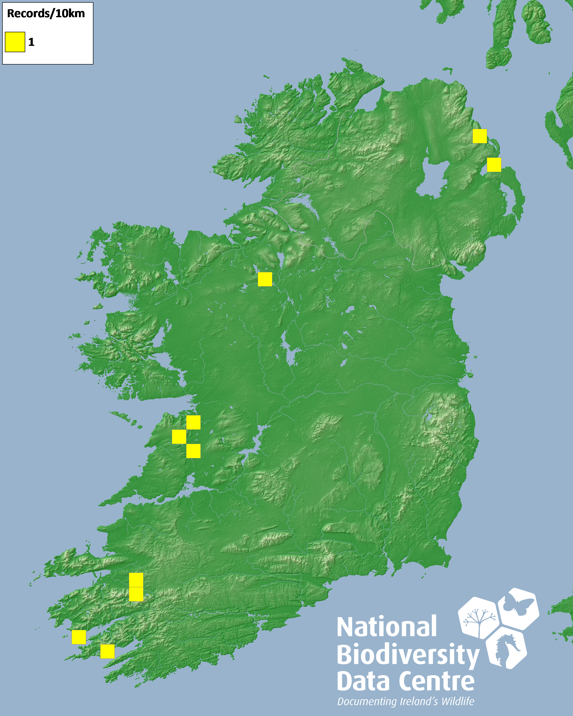 Distribution of the number of records recorded within each 10km grid square (ITM).Marine Map - 50km