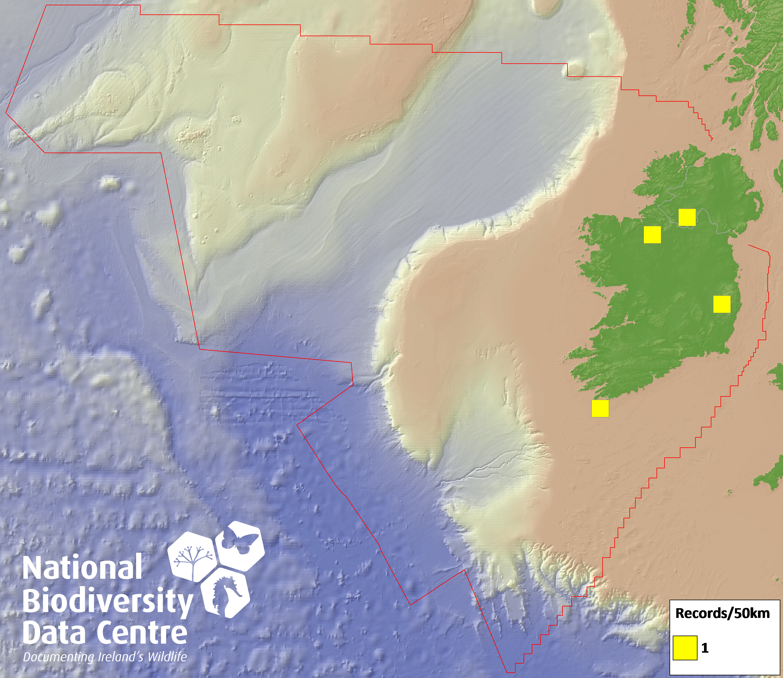 Distribution of the number of records recorded within each 10km grid square (ITM).Marine Map - 50km