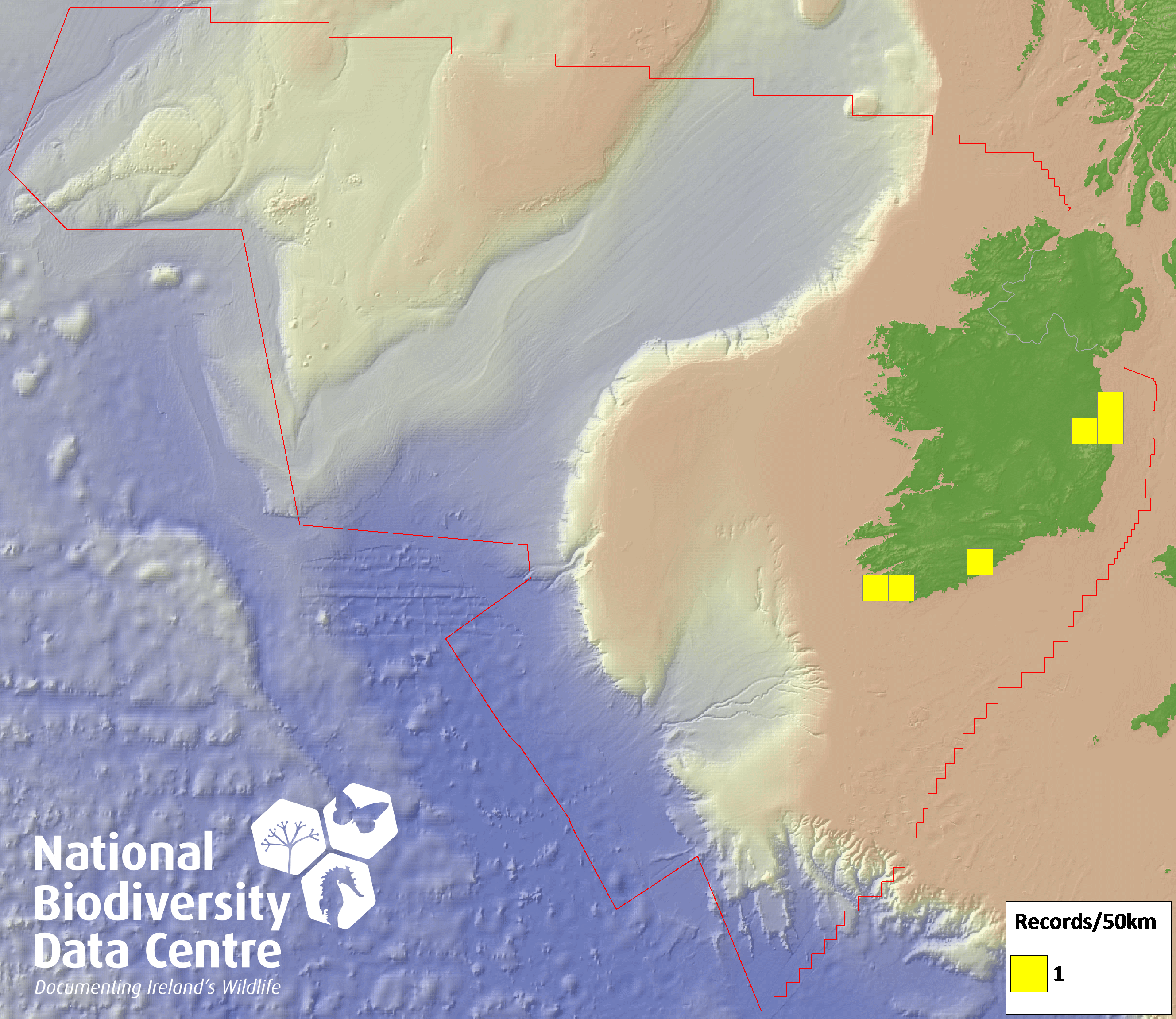 Distribution of the number of records recorded within each 10km grid square (ITM).Marine Map - 50km