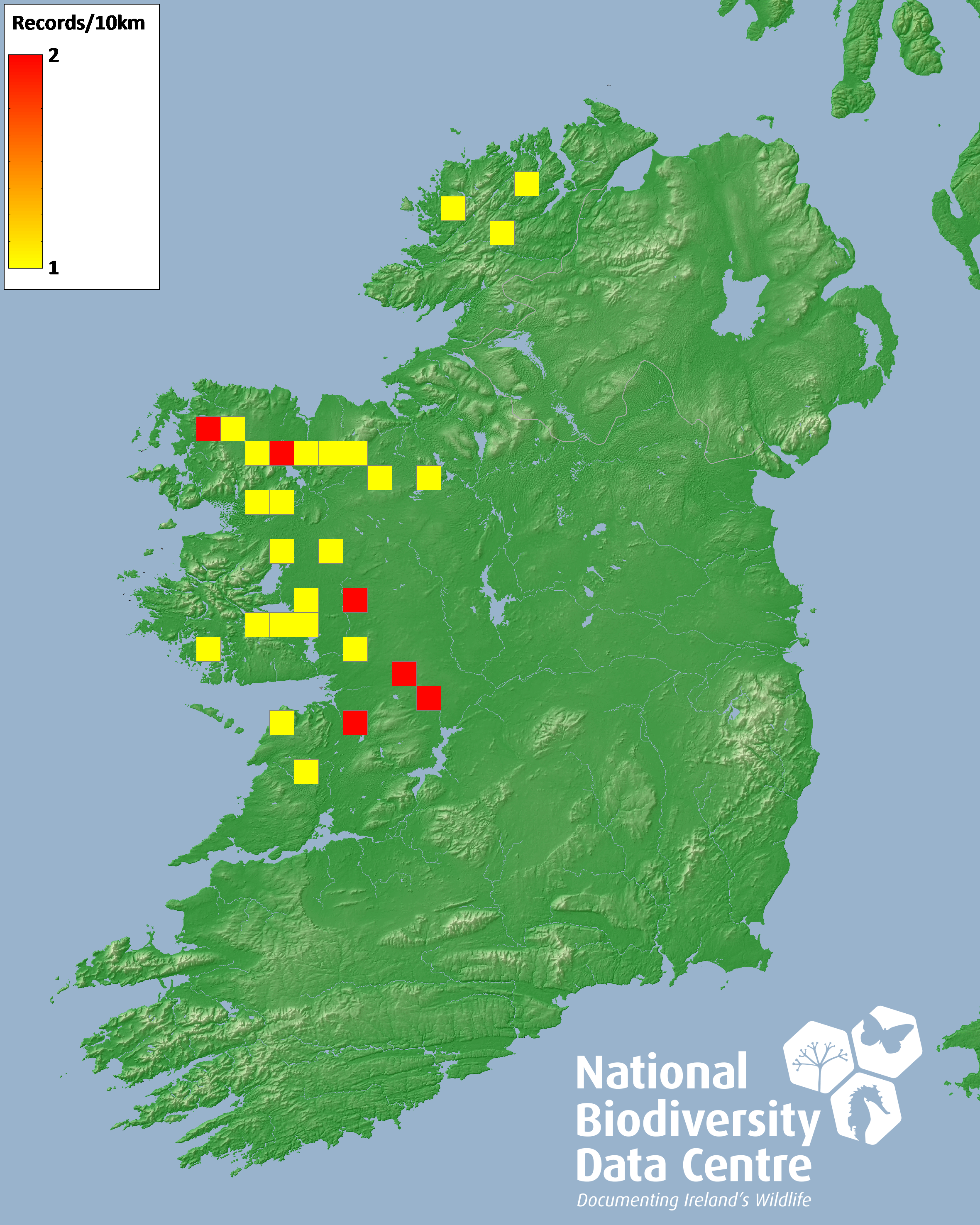 Distribution of the number of records recorded within each 10km grid square (ITM).Marine Map - 50km