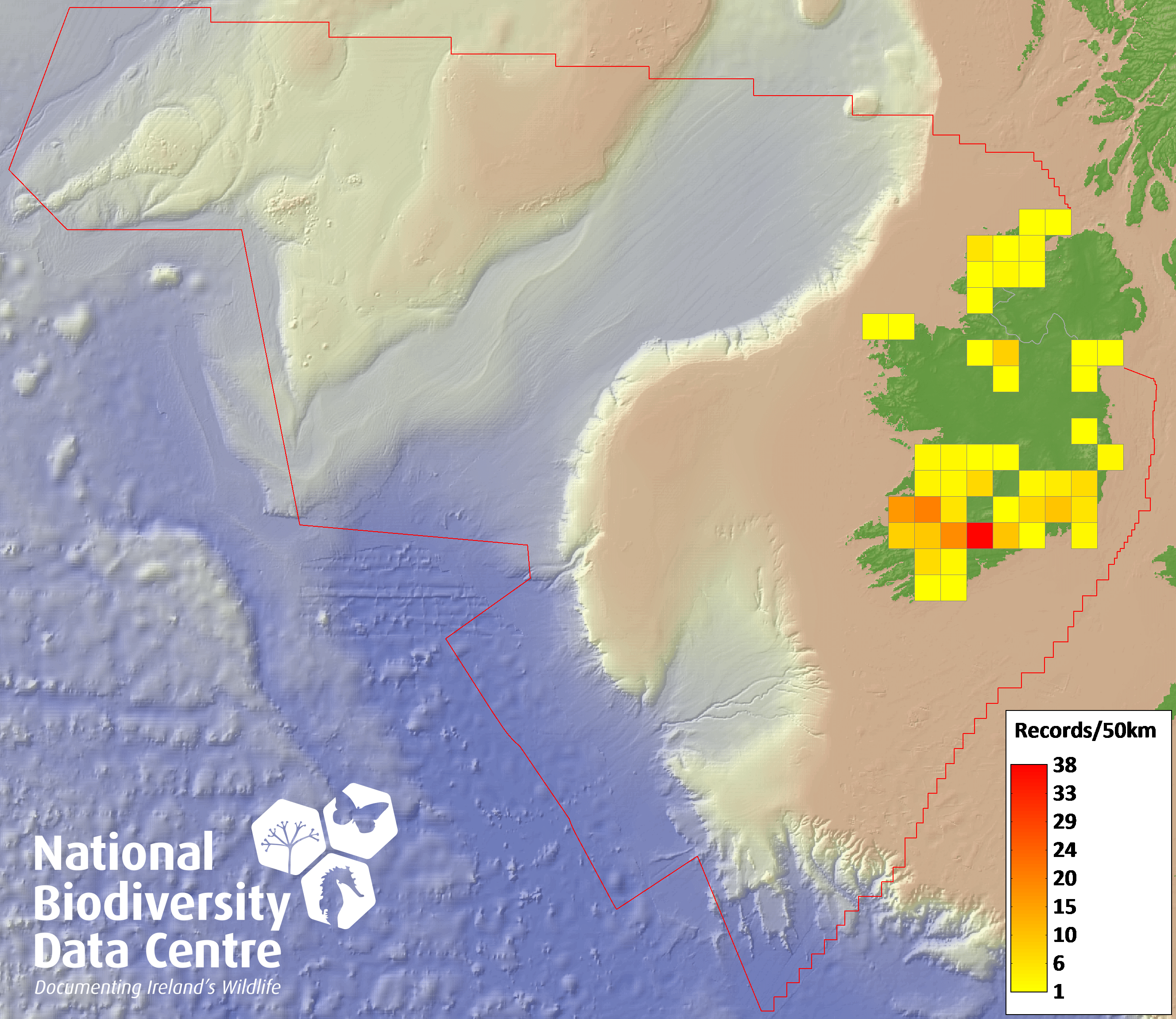 Distribution of the number of records recorded within each 10km grid square (ITM).Marine Map - 50km