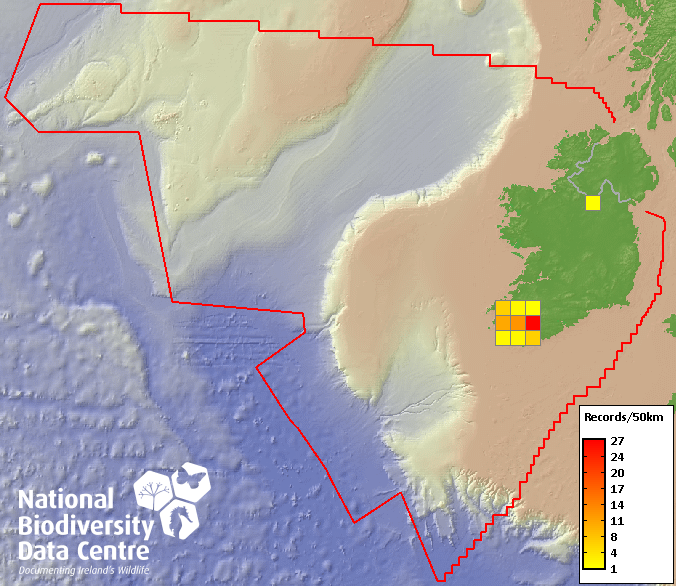 Distribution of the number of records recorded within each 10km grid square (ITM).Marine Map - 50km