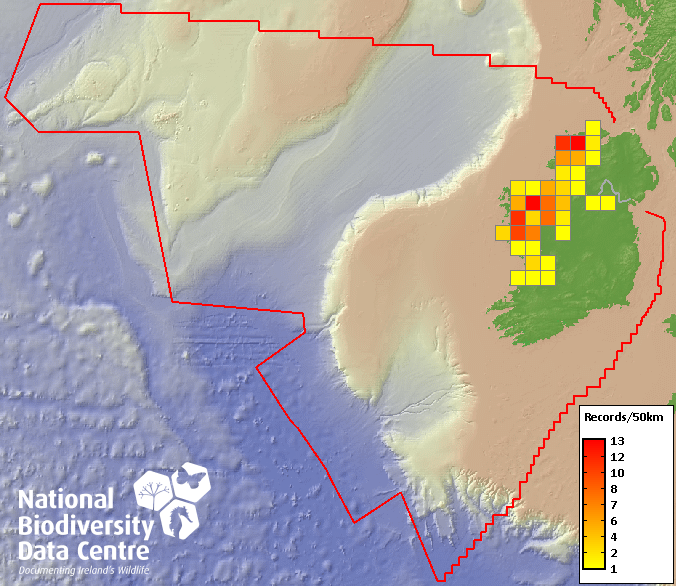 Distribution of the number of records recorded within each 10km grid square (ITM).Marine Map - 50km