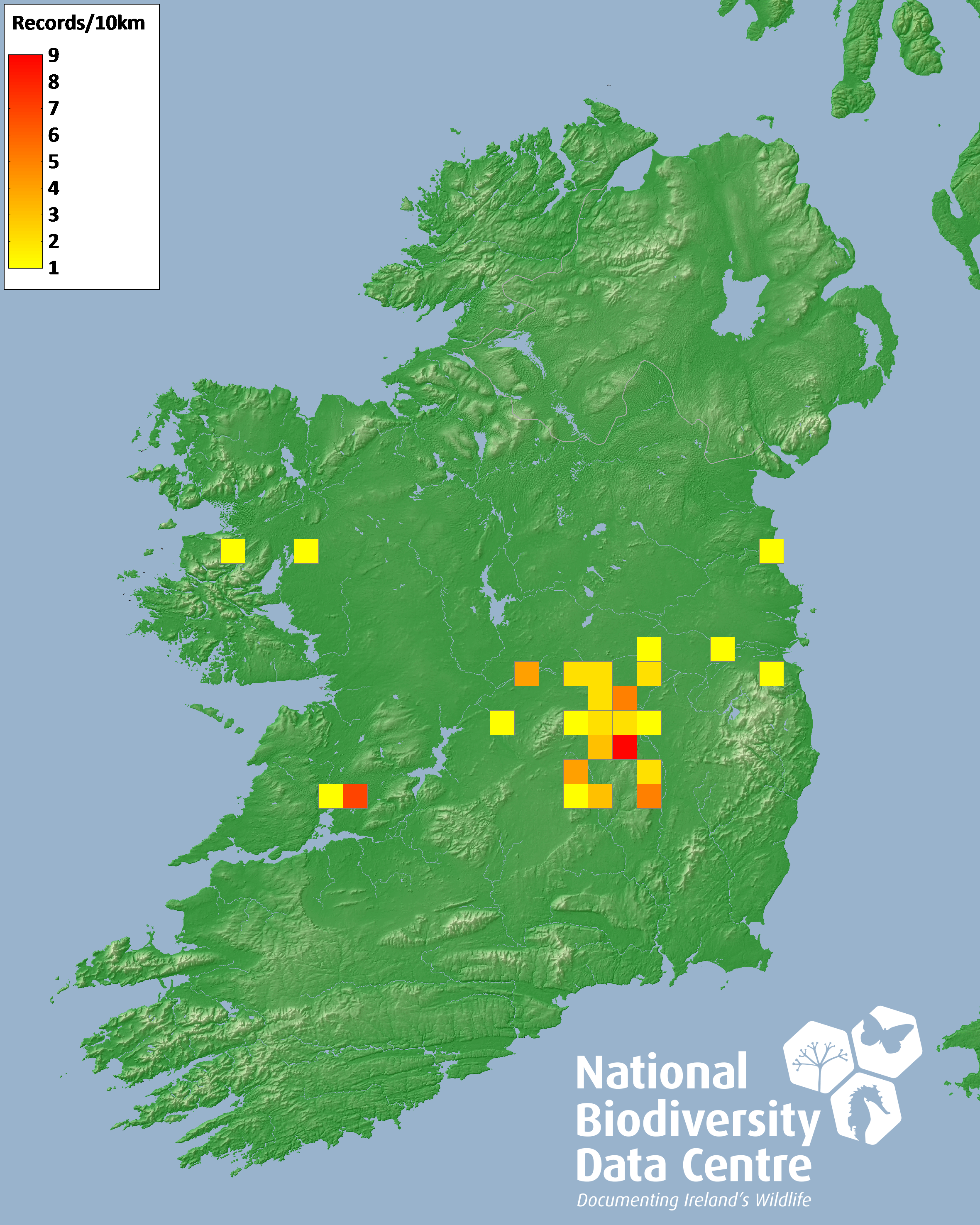 Distribution of the number of records recorded within each 10km grid square (ITM).Marine Map - 50km
