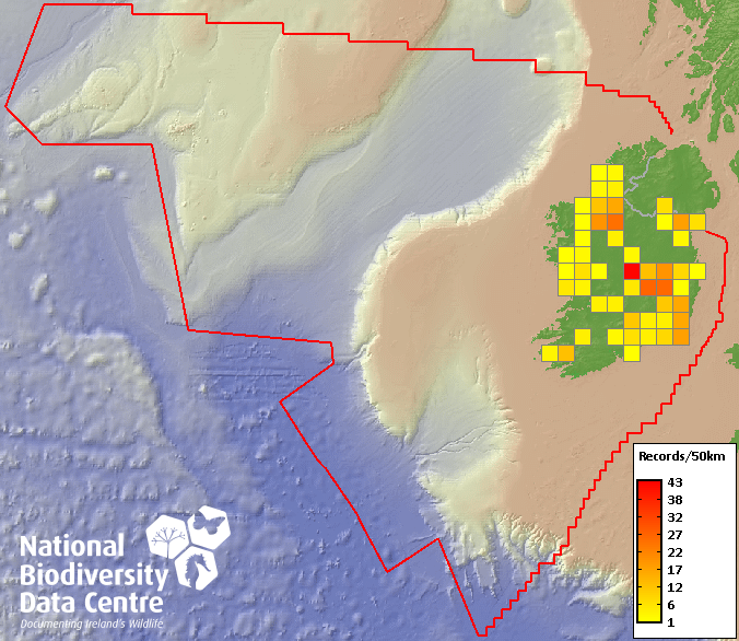 Distribution of the number of records recorded within each 10km grid square (ITM).Marine Map - 50km
