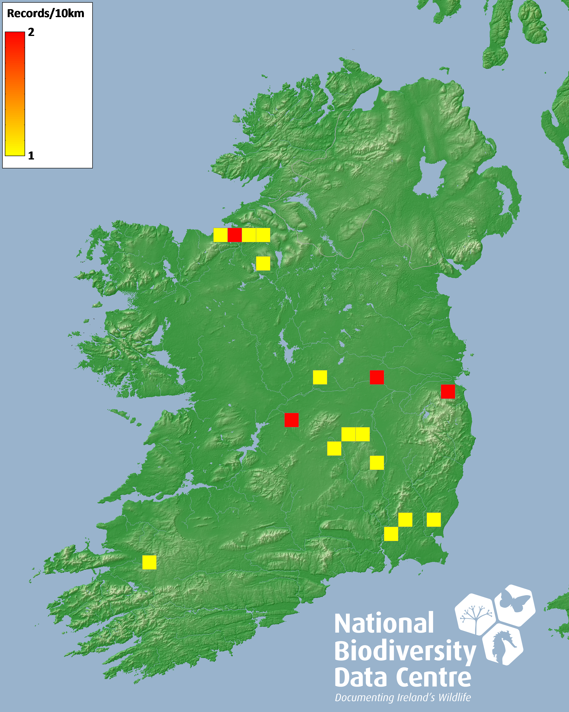 Distribution of the number of records recorded within each 10km grid square (ITM).Marine Map - 50km