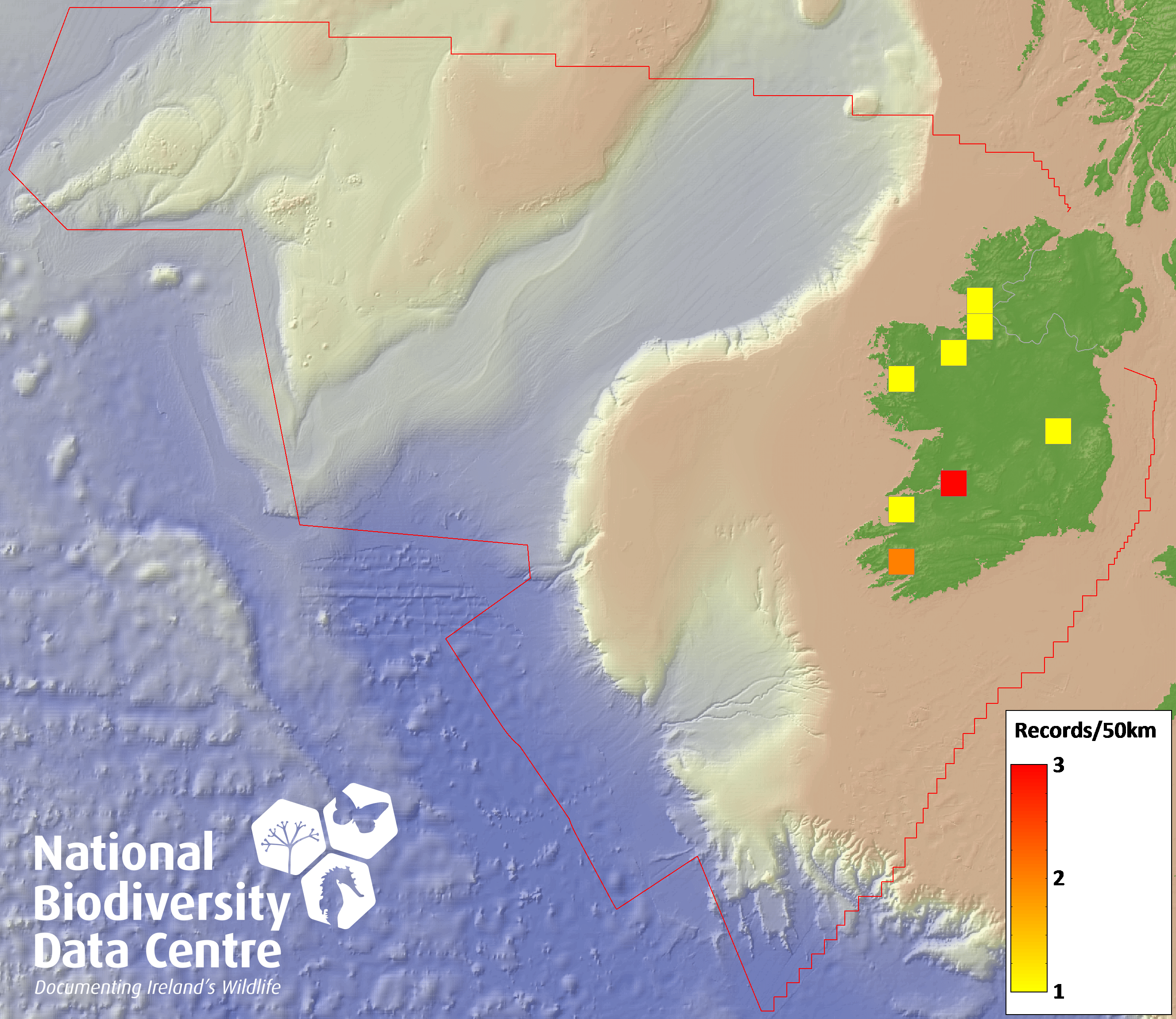 Distribution of the number of records recorded within each 10km grid square (ITM).Marine Map - 50km