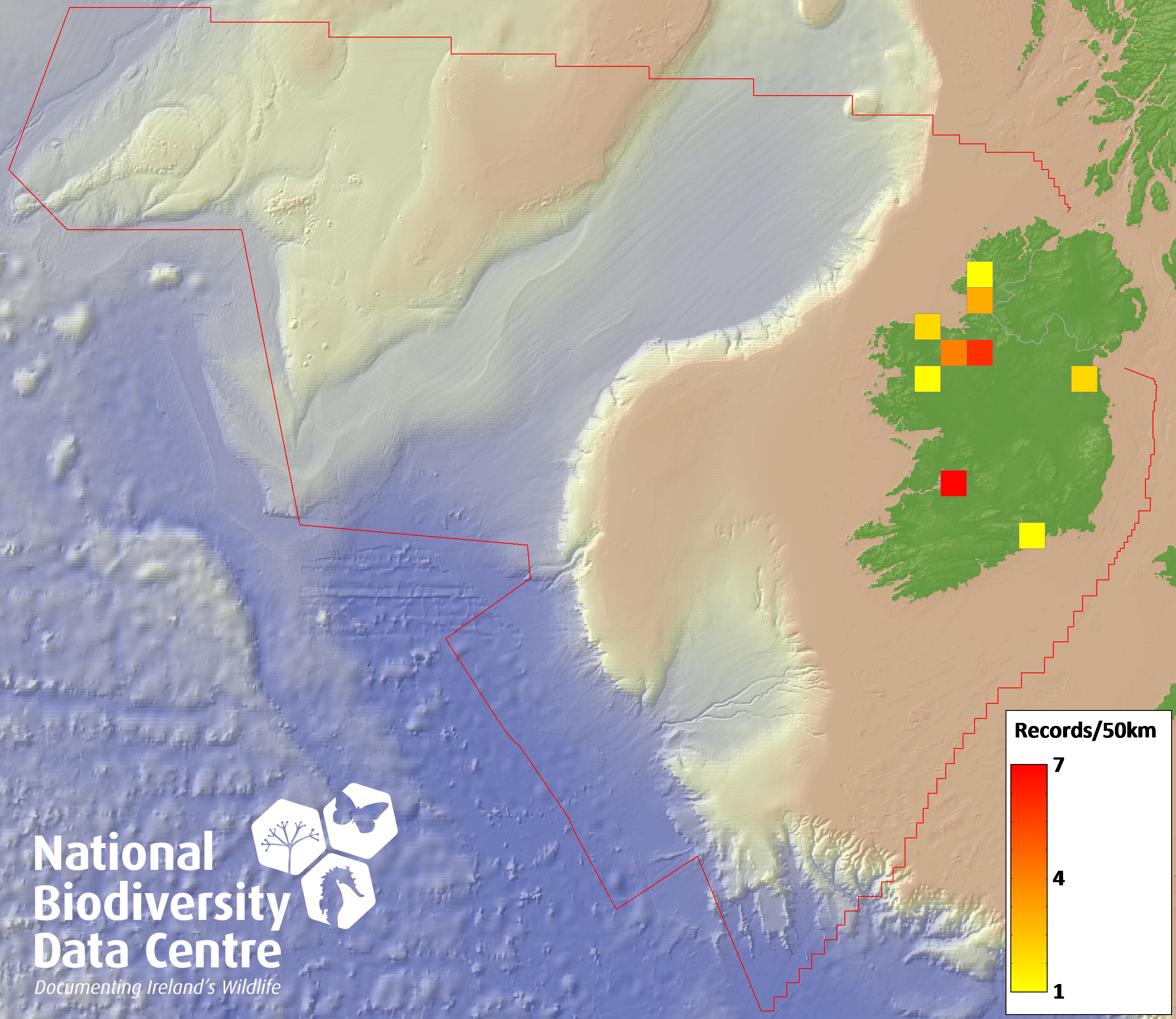 Distribution of the number of records recorded within each 10km grid square (ITM).Marine Map - 50km