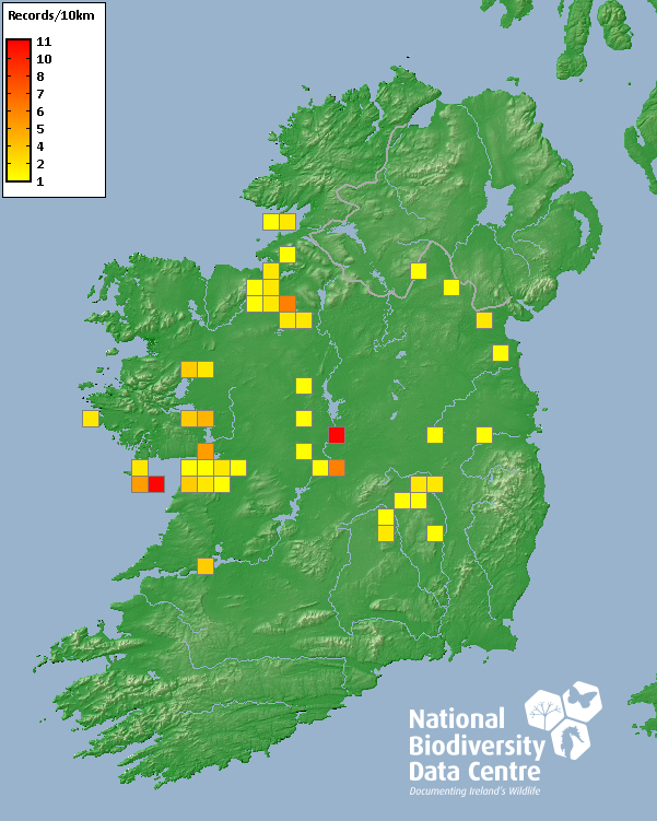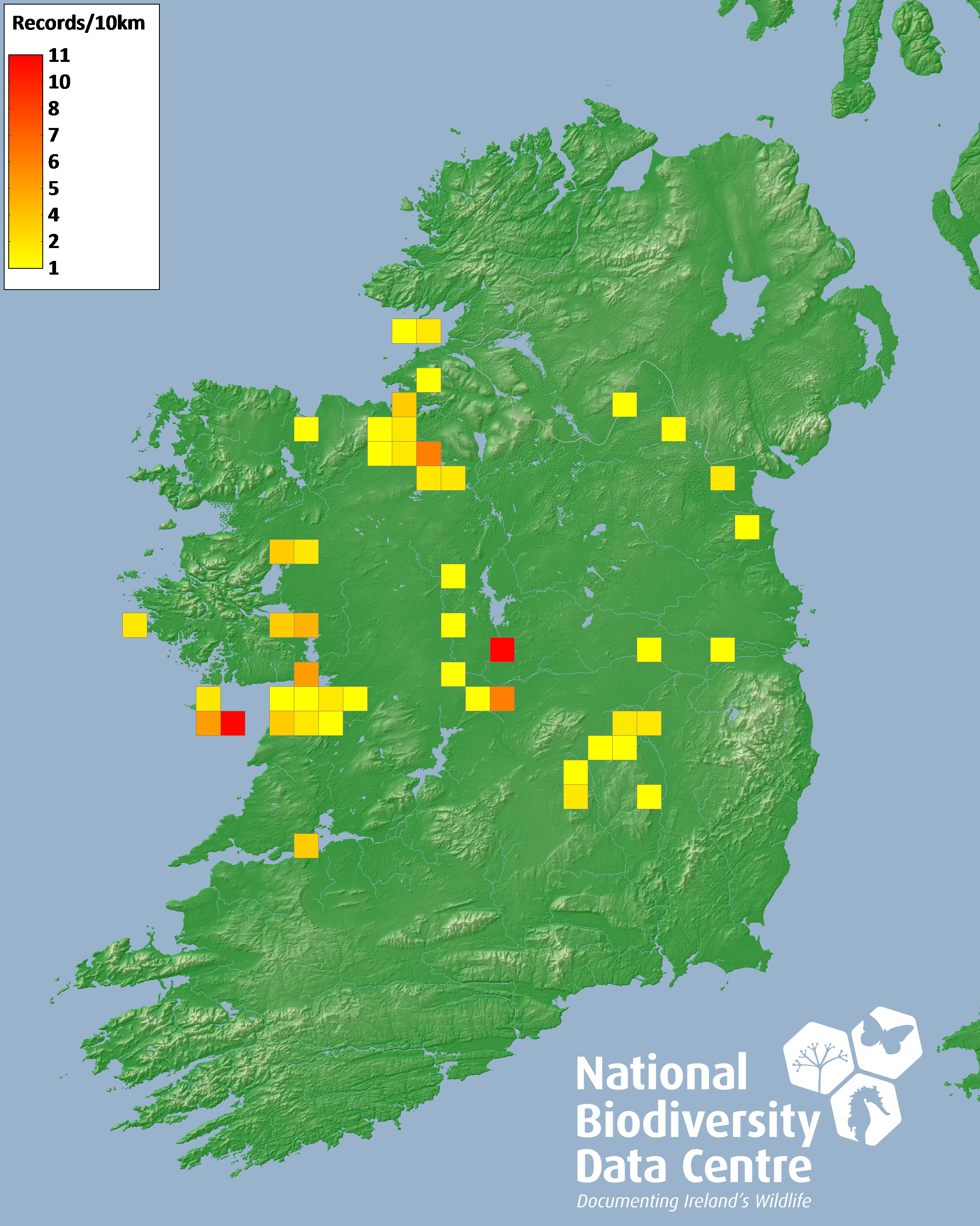 Distribution of the number of records recorded within each 10km grid square (ITM).Marine Map - 50km