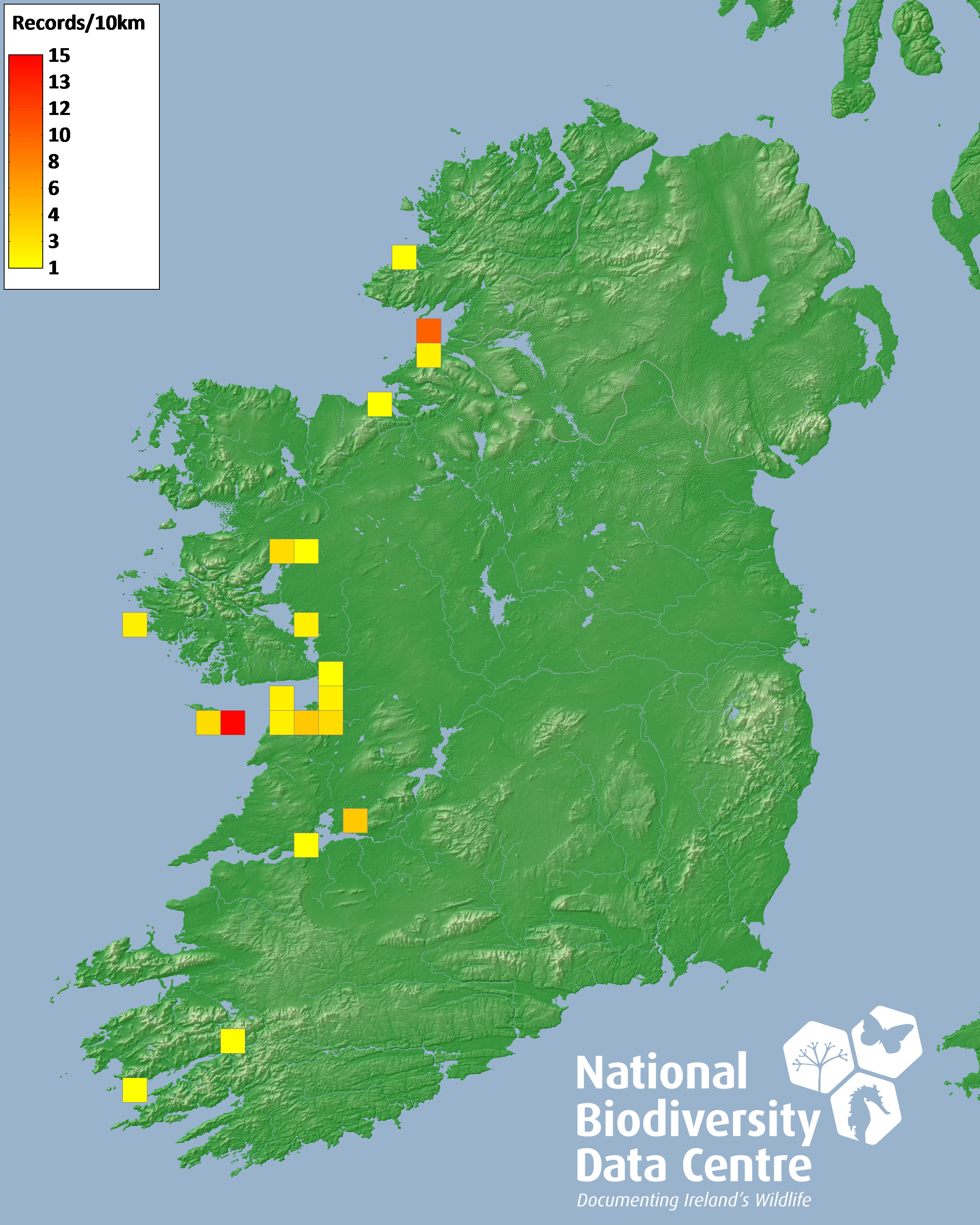 Distribution of the number of records recorded within each 10km grid square (ITM).Marine Map - 50km