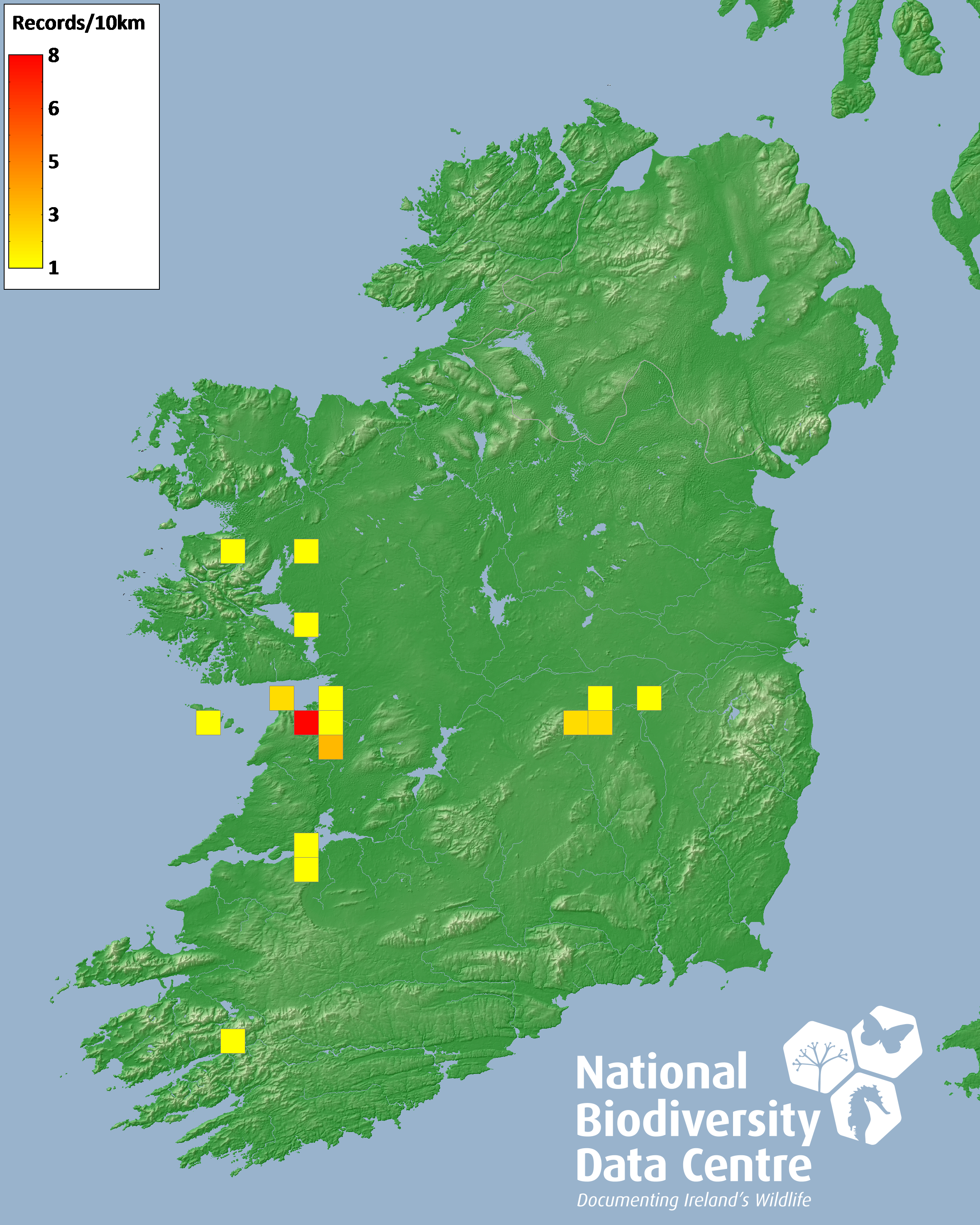 Distribution of the number of records recorded within each 10km grid square (ITM).Marine Map - 50km