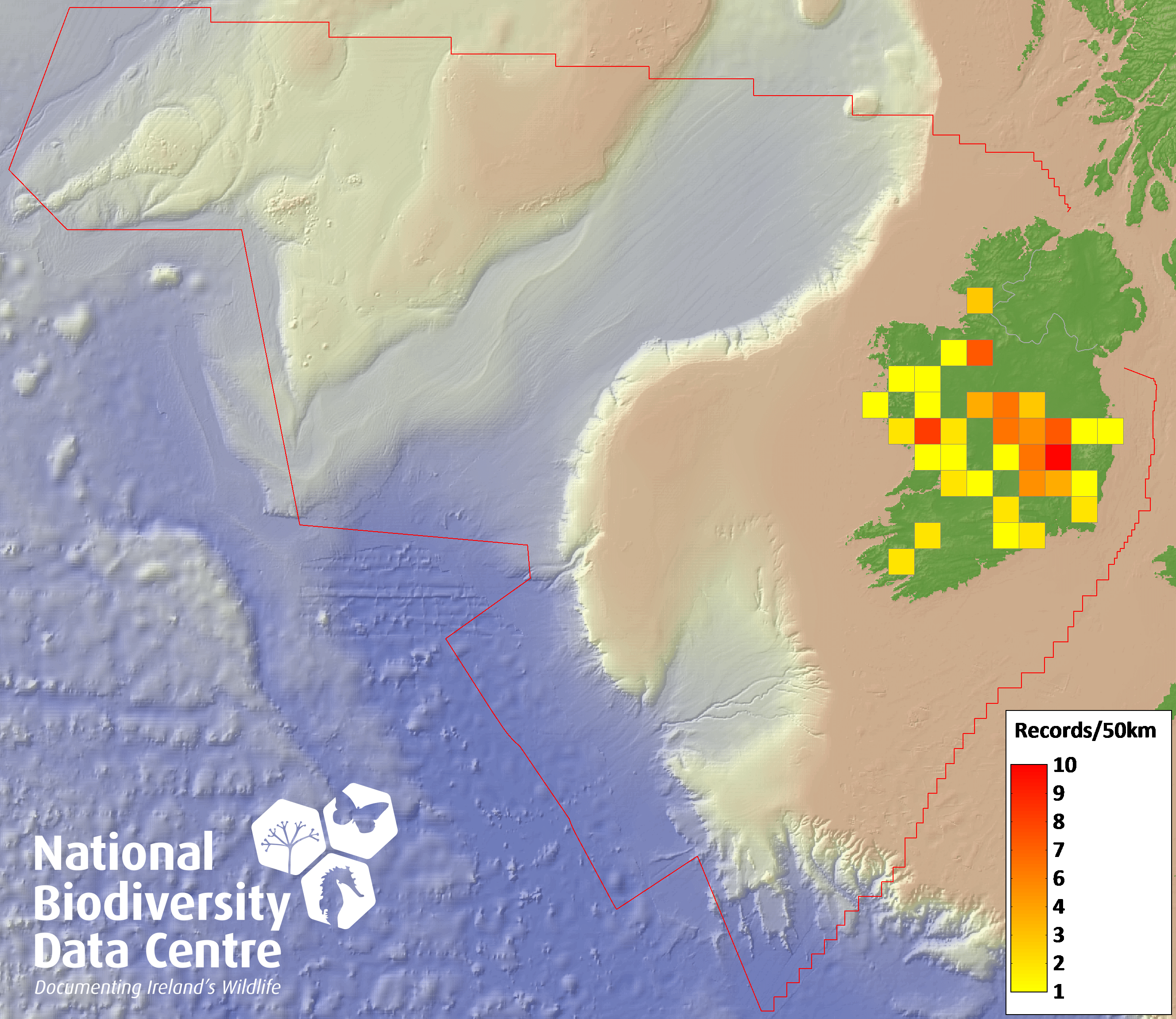 Distribution of the number of records recorded within each 10km grid square (ITM).Marine Map - 50km