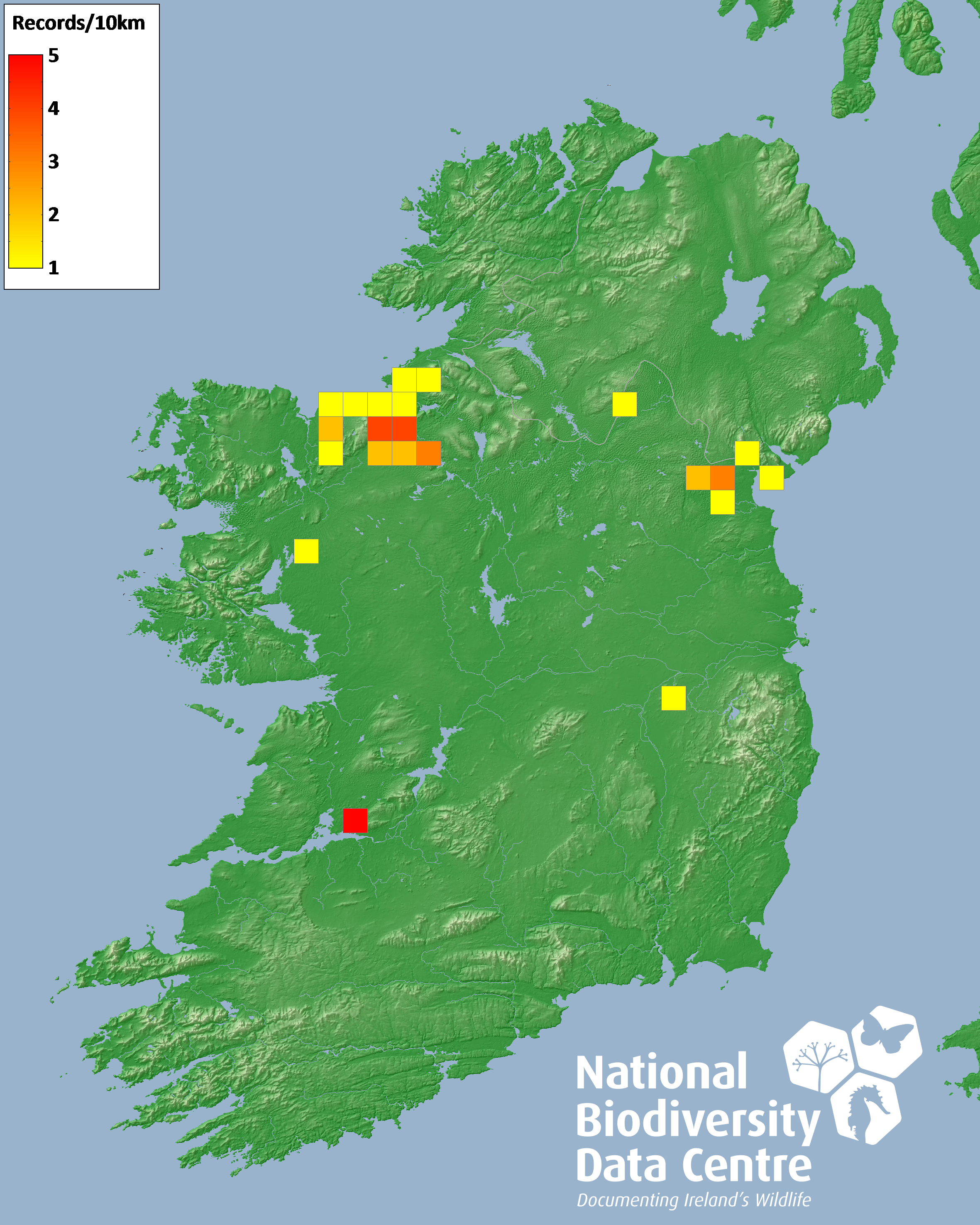 Distribution of the number of records recorded within each 10km grid square (ITM).Marine Map - 50km