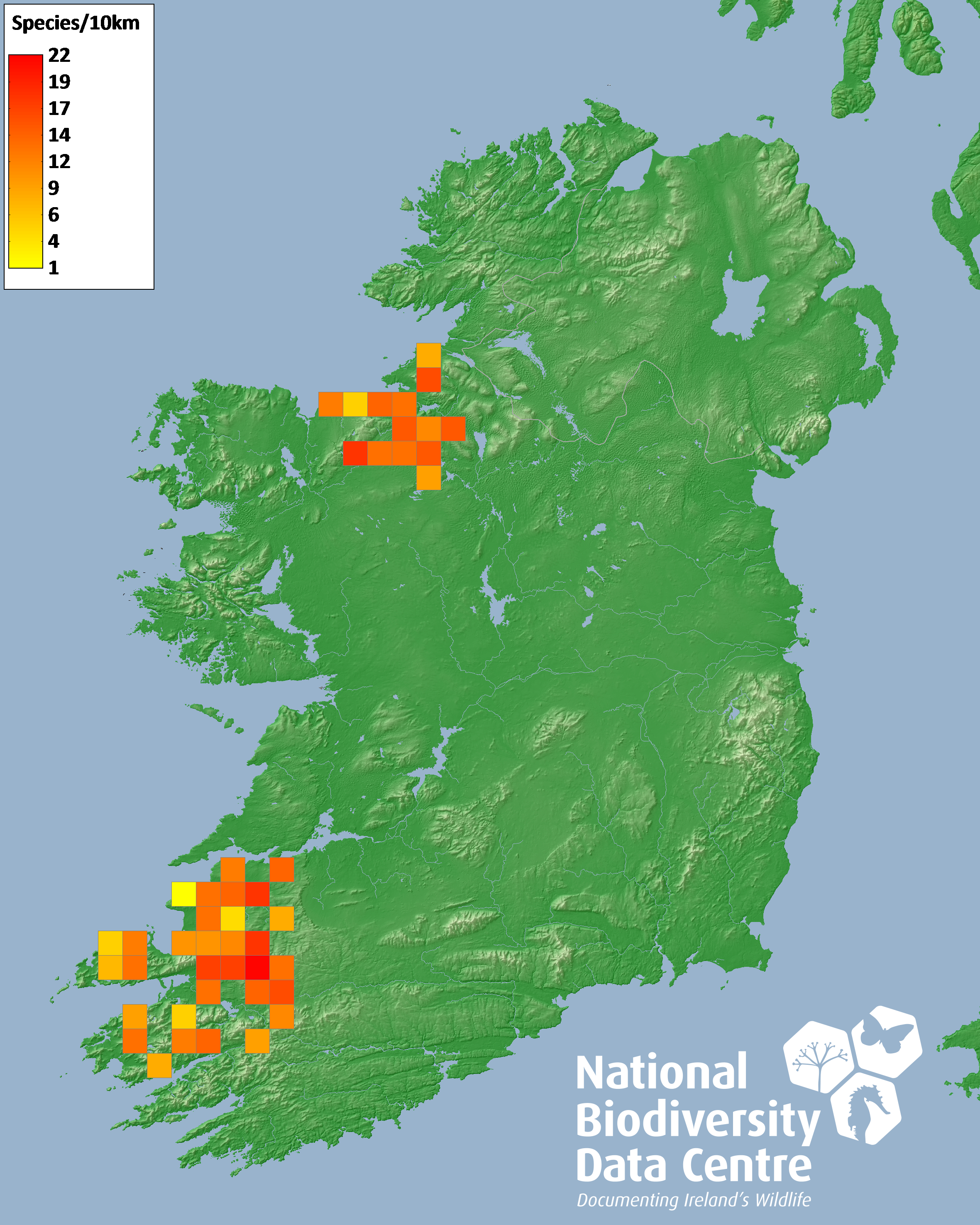 Distribution of the number of species recorded within each 10km grid square (ITM).Marine Map - 50Km