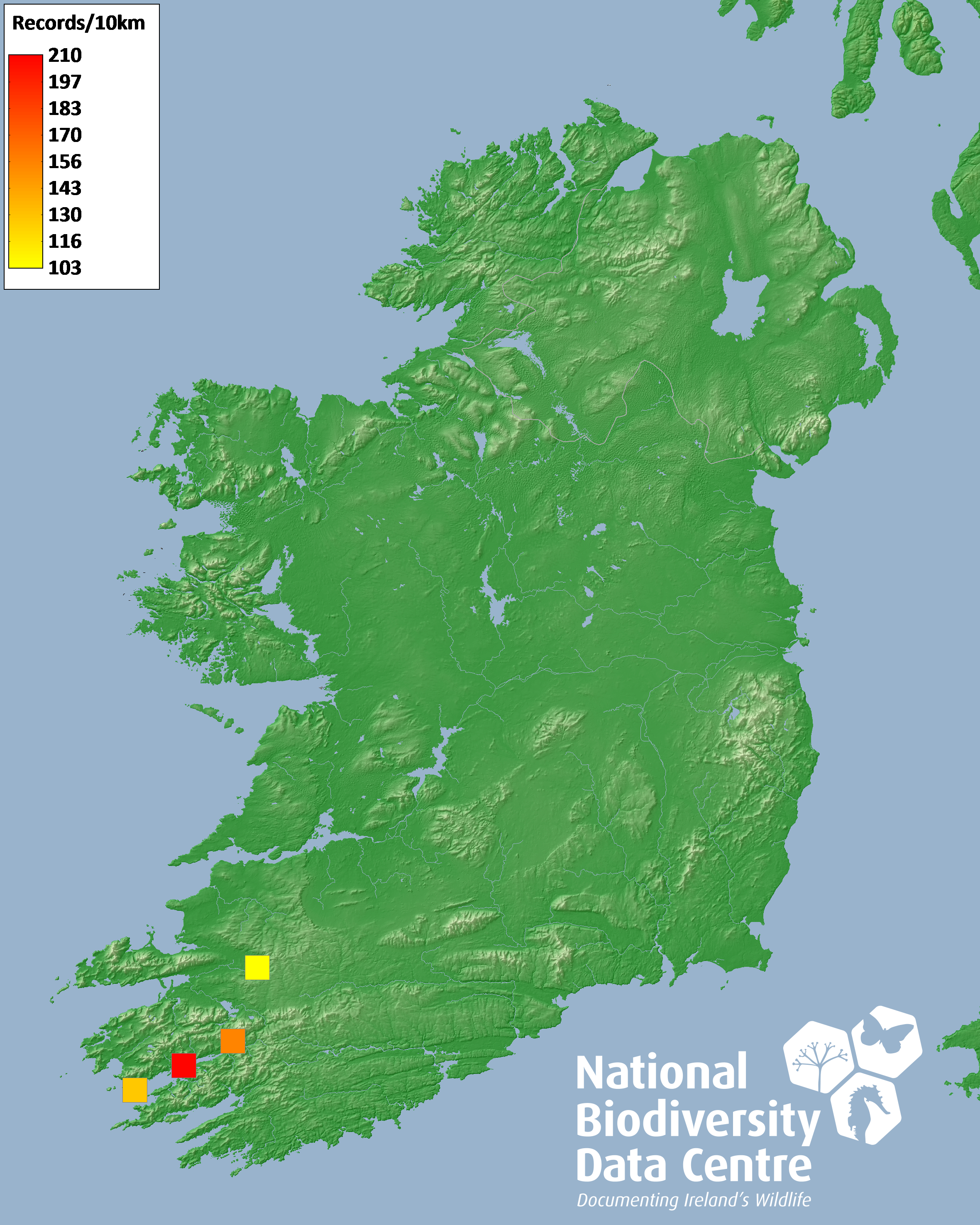 Distribution of the number of records within each 10km grid square (ITM).Marine Map - 50Km
