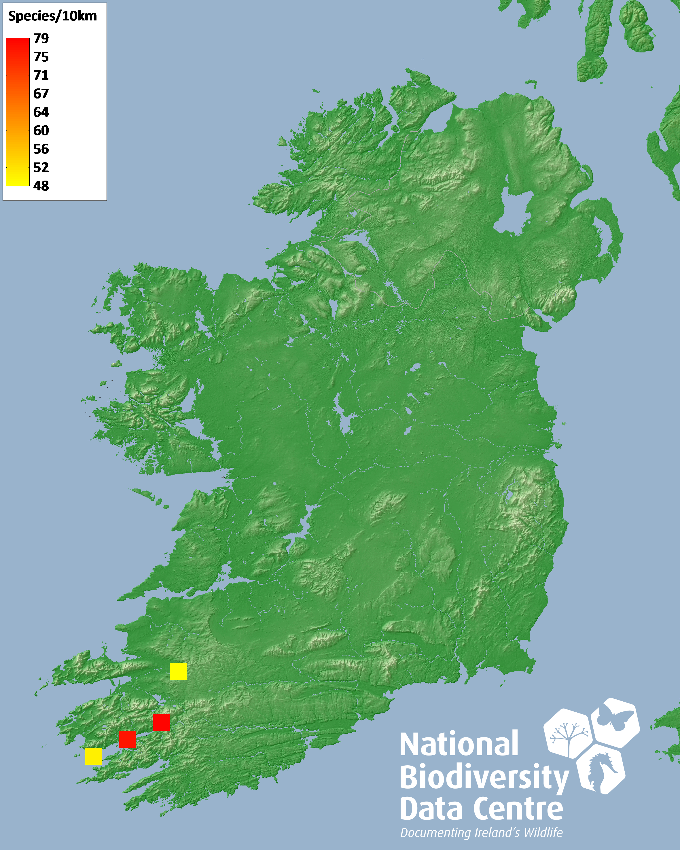 Distribution of the number of species recorded within each 10km grid square (ITM).Marine Map - 50Km