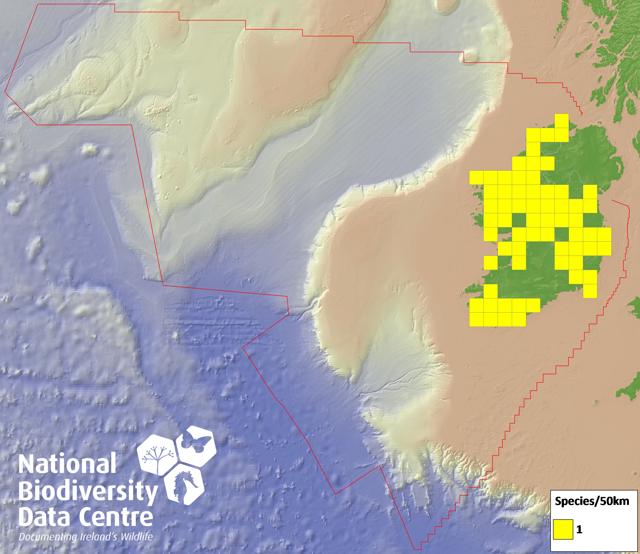 Distribution of the number of records within each 10km grid square (ITM).Marine Map - 50Km