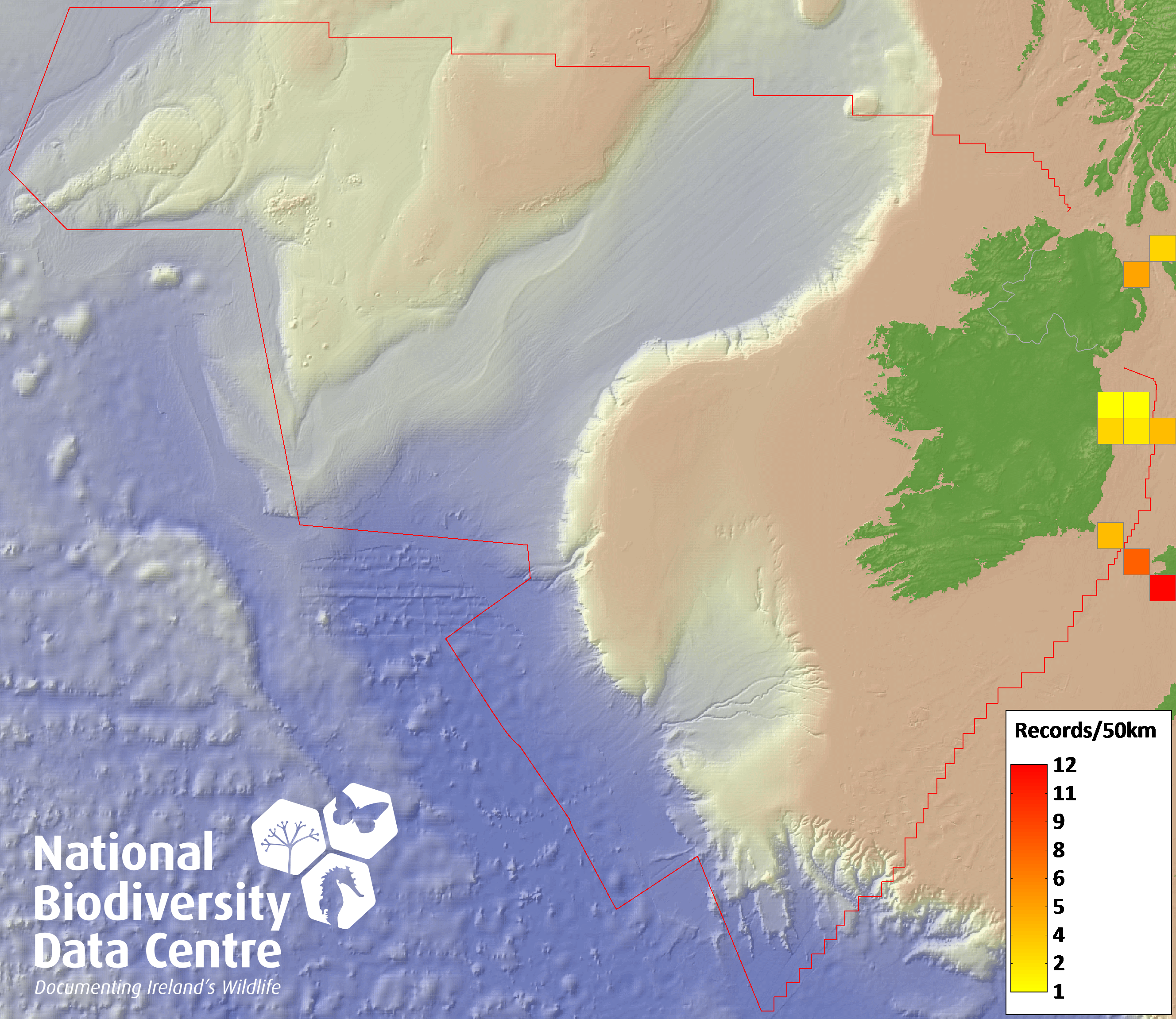 Distribution of the number of records recorded within each 10km grid square (ITM).Marine Map - 50km