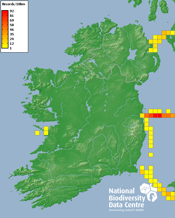 Distribution of the number of records recorded within each 10km grid square (ITM).Marine Map - 50km