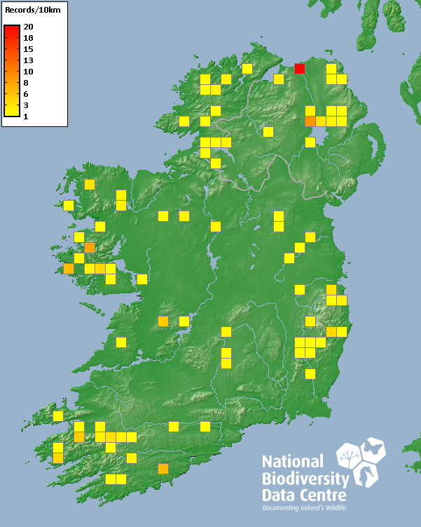 Distribution of the number of records recorded within each 10km grid square (ITM).Marine Map - 50km