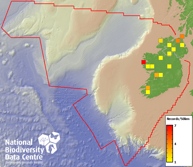 Distribution of the number of records recorded within each 10km grid square (ITM).Marine Map - 50km