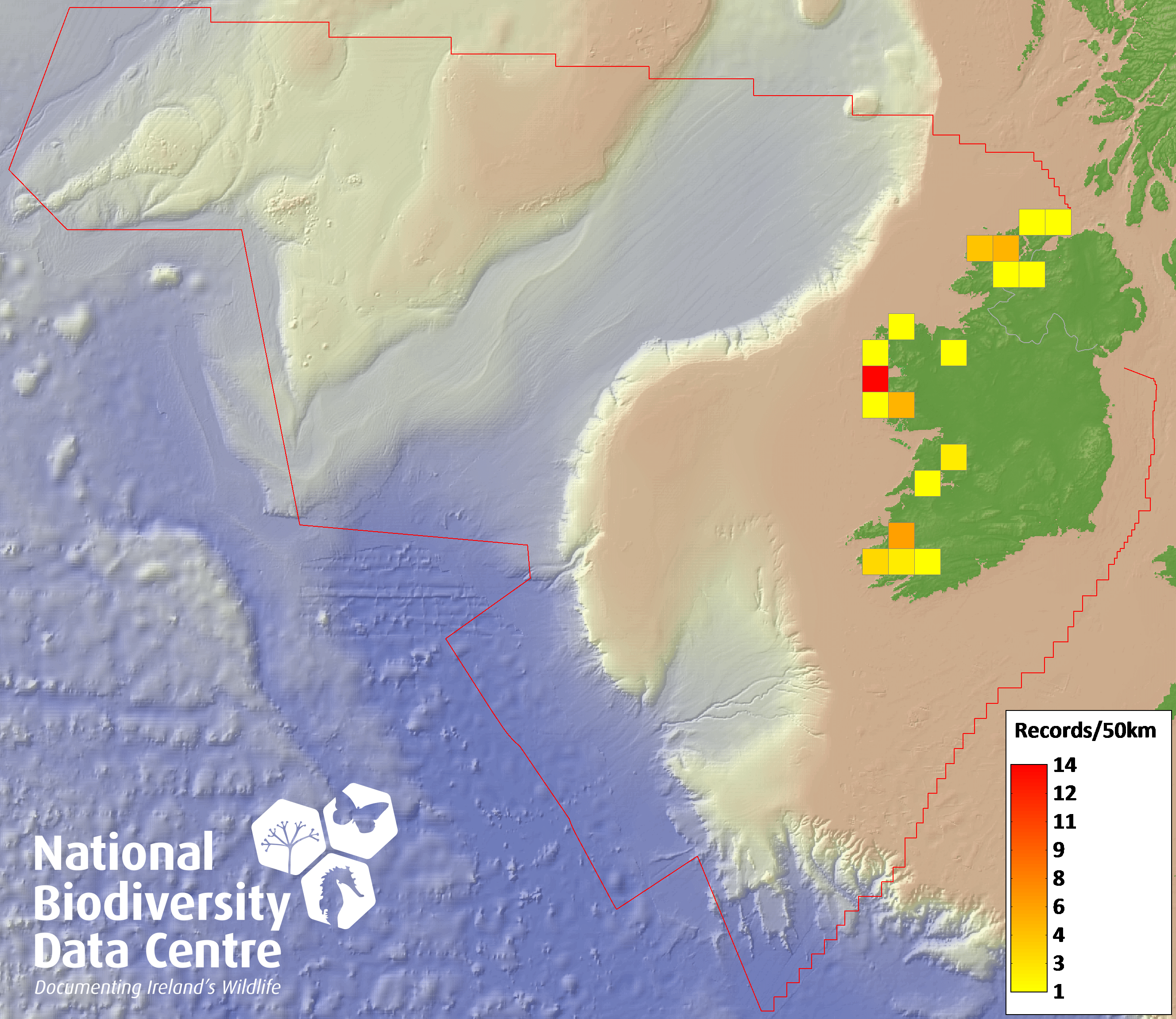 Distribution of the number of records recorded within each 10km grid square (ITM).Marine Map - 50km