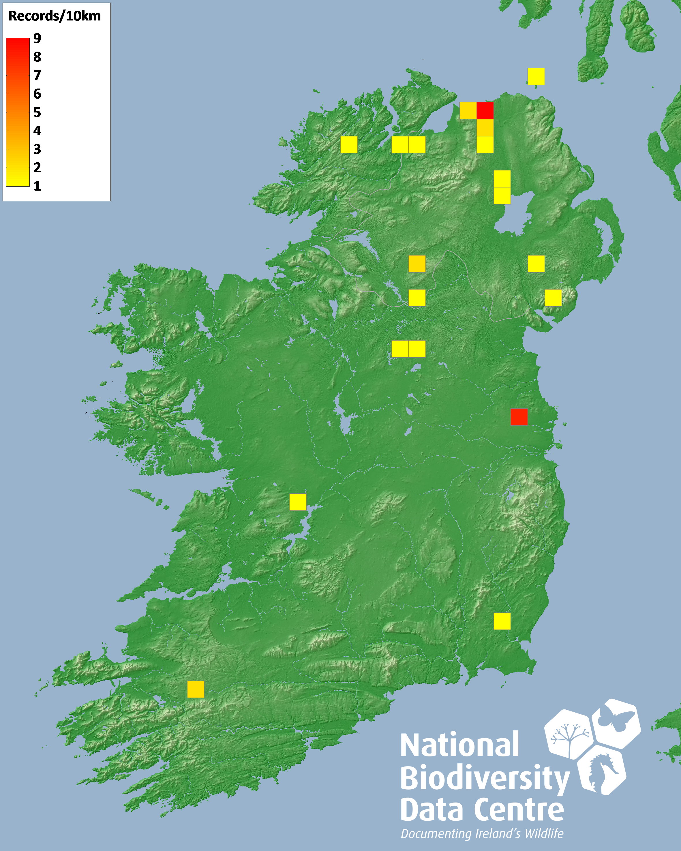 Distribution of the number of records recorded within each 10km grid square (ITM).Marine Map - 50km