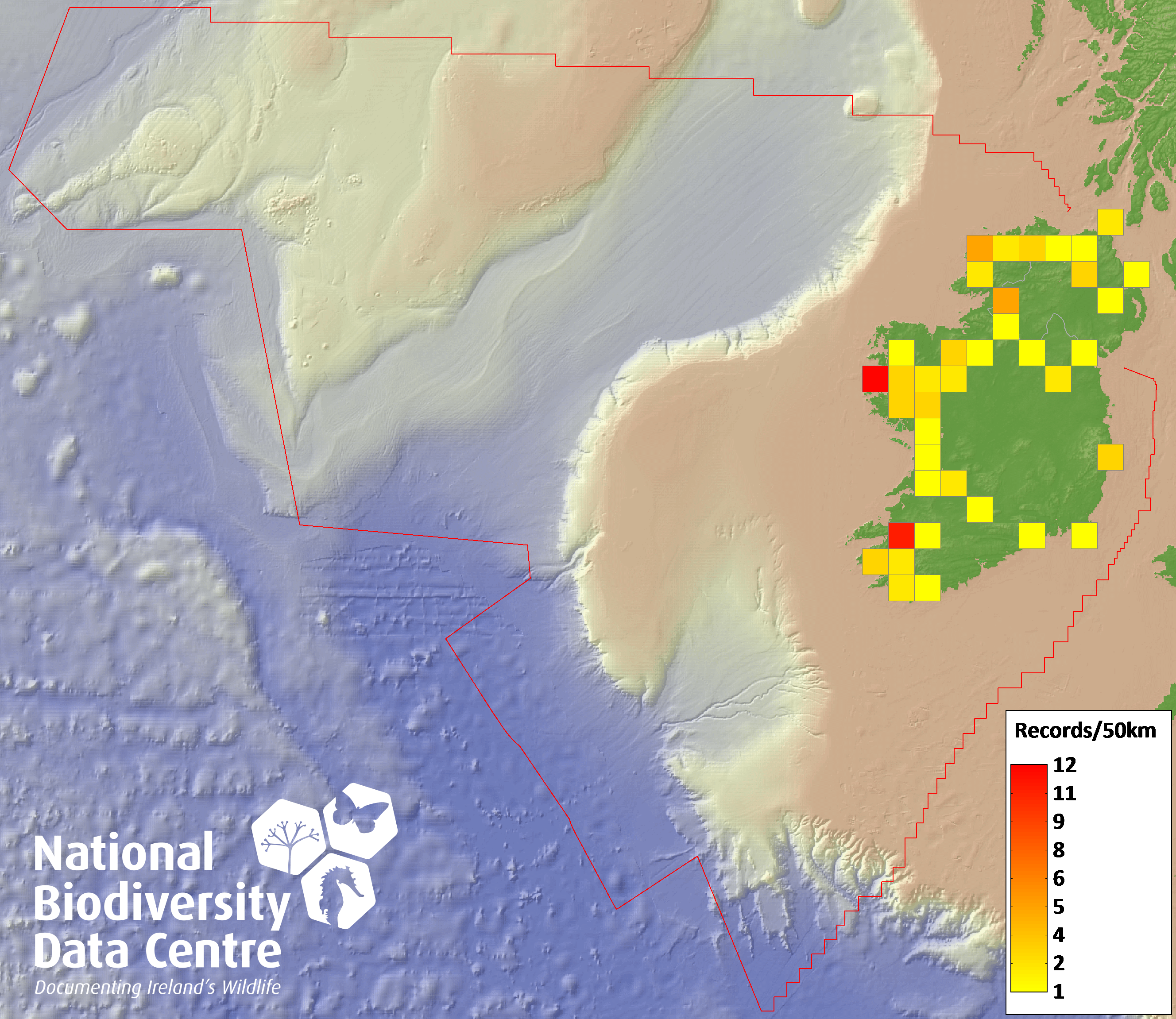 Distribution of the number of records recorded within each 10km grid square (ITM).Marine Map - 50km