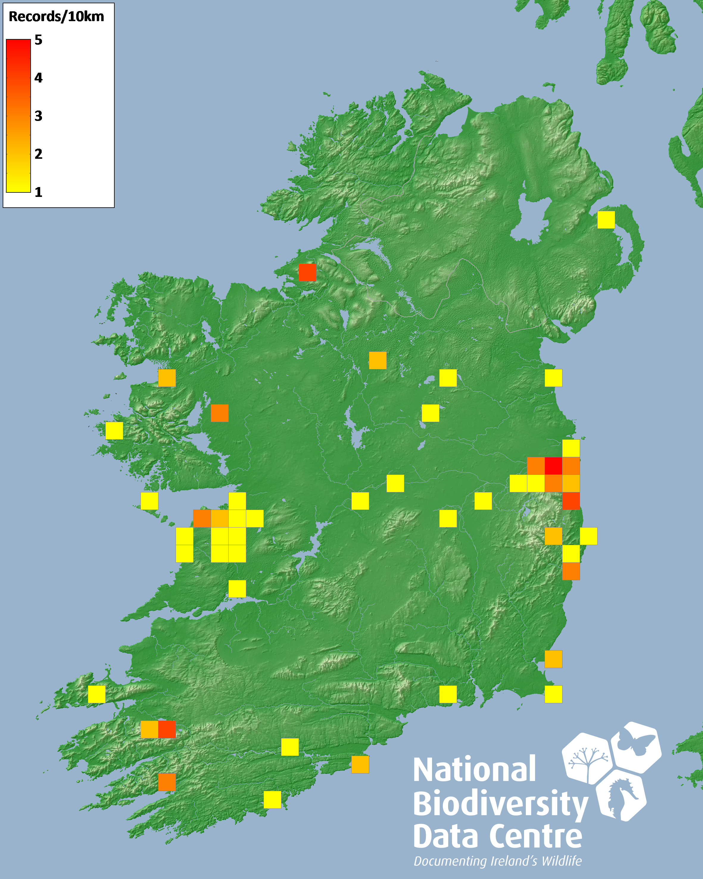 Distribution of the number of records within each 10km grid square (ITM).Marine Map - 50Km