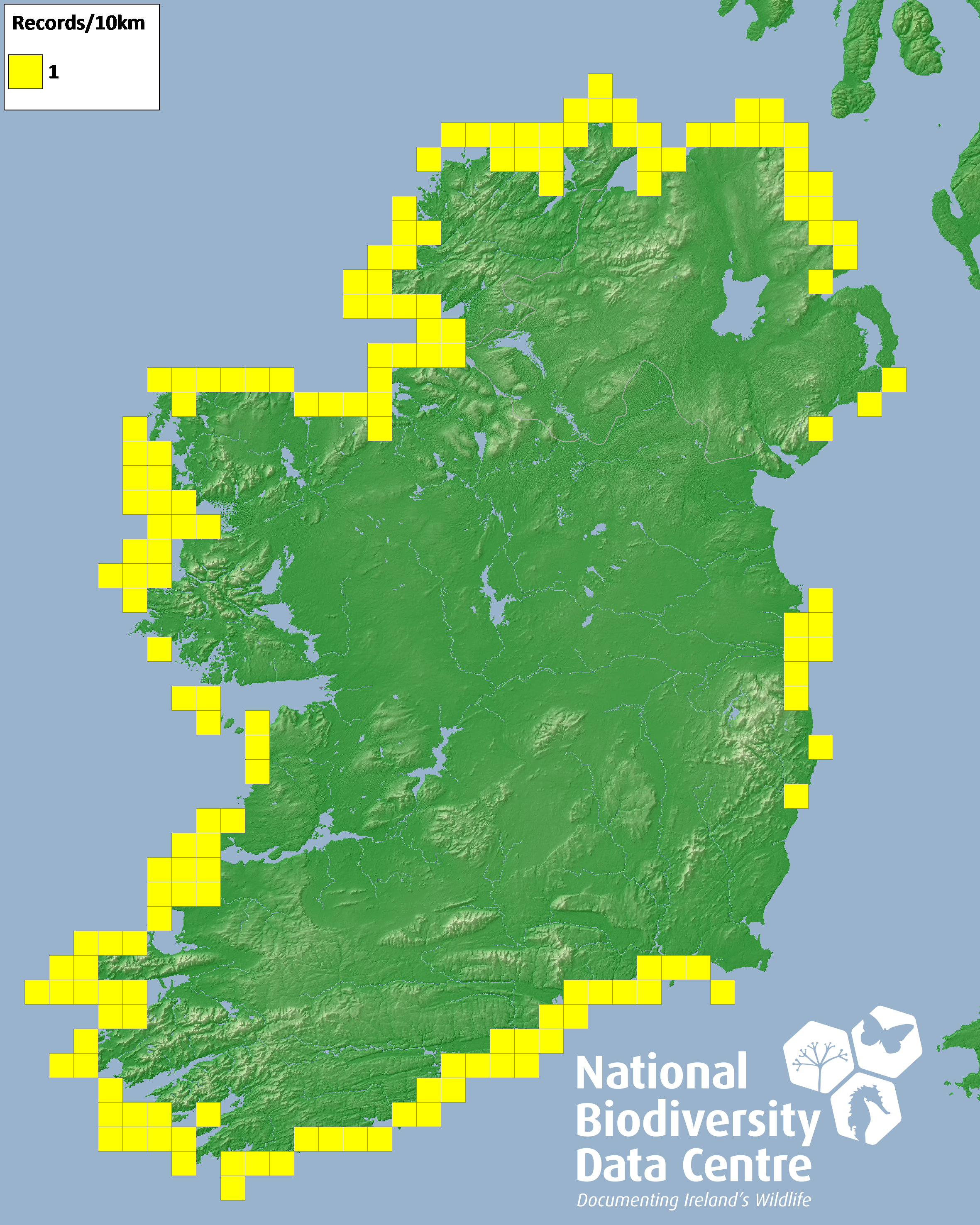 Distribution of the number of records recorded within each 10km grid square (ITM).Marine Map - 50km